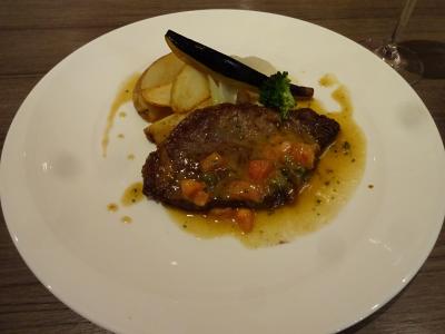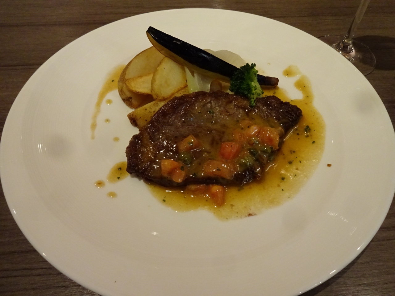 前菜のサラダとスープがサーブされ、メインはビーフステーキ。薄めの肉でしたが、ミディアムレアの焼き加減でおいしかったです。デザートはパンナコッタとシャーベットで、予想以上のボリュームでした。