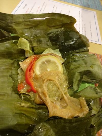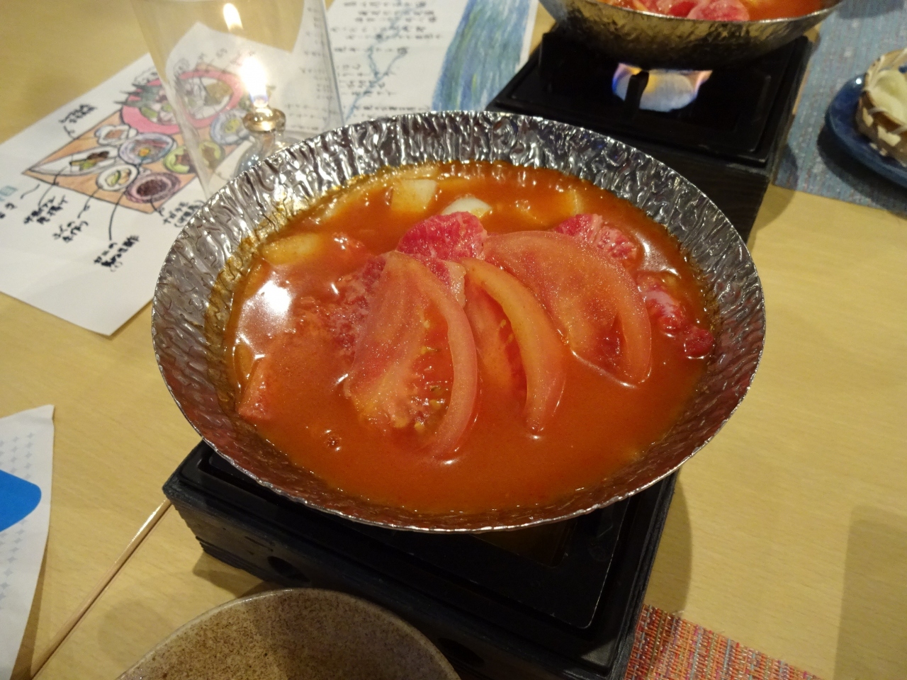 夕食は、和洋エスニック混在といった感じでした。始めはお造り。その後は鯛にグリーンカレーをかけた一品。メインは氷見牛のトマトスープ。「温泉旅館の夕飯=和食」と言う方には、期待外れという感想を抱いたのではないかと思います。