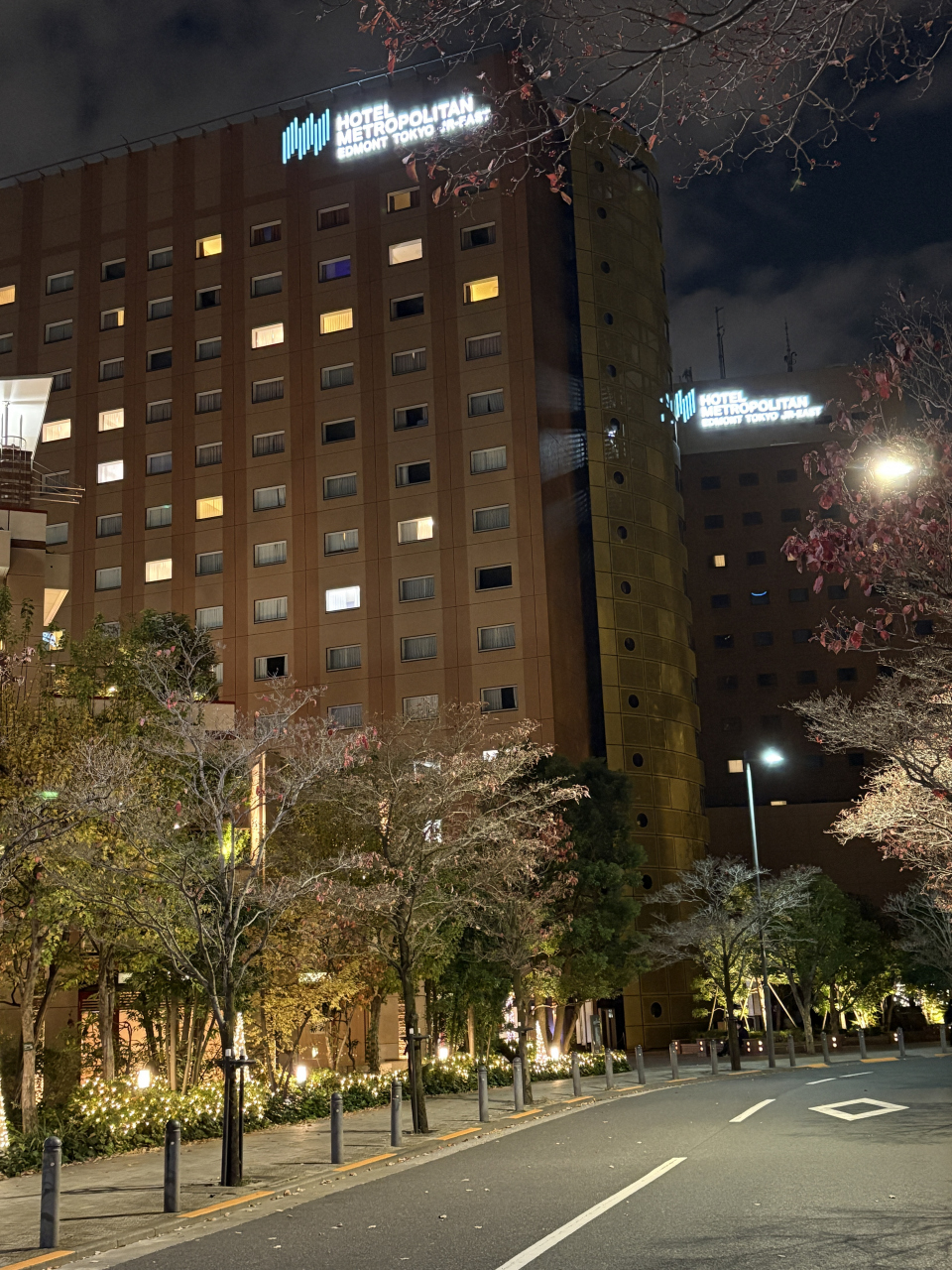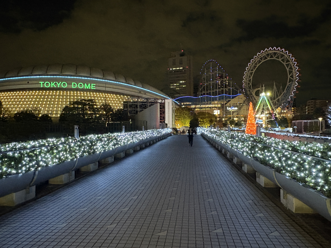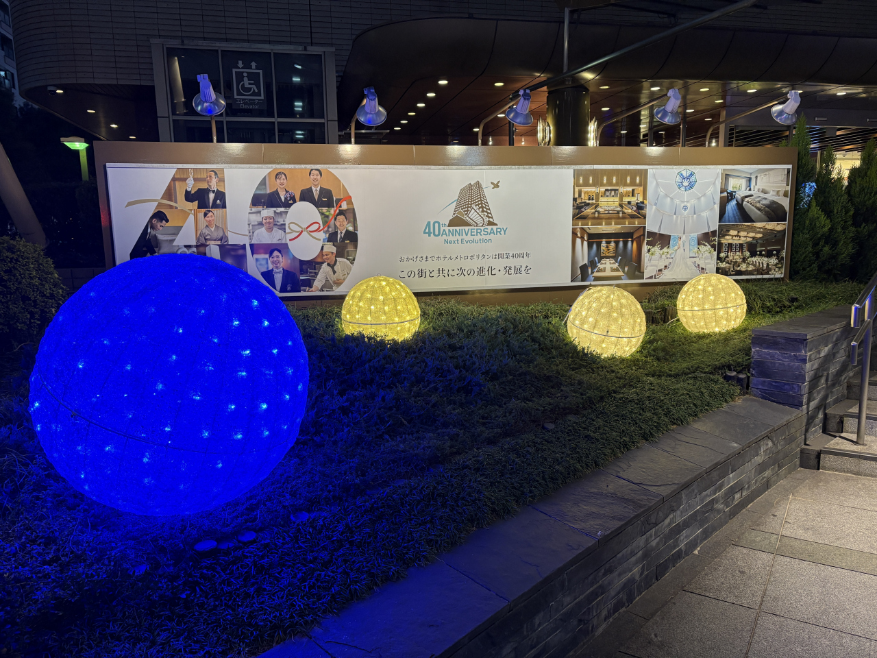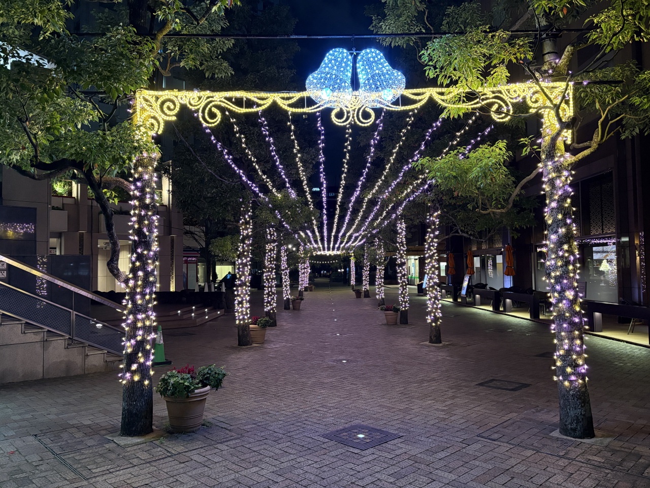 JR水道橋駅から7分ほどのところに建つ、開業40年の2棟からなるホテルです。ライトアップされたクリスマスの雰囲気を感じたくて訪れました。ホテル内には小さめのクリスマスツリーが数本飾られているだけでしたが、イーストウィングの入口に白を基調にした、LED 電球が巻き付けられた装飾がきれいに設置されていました。ホテル内の装飾はいまいちでしたが、駅からホテルに向かう道路は電球で装飾され、人通りも少なく静かでサイレントナイトという雰囲気が感じられました。