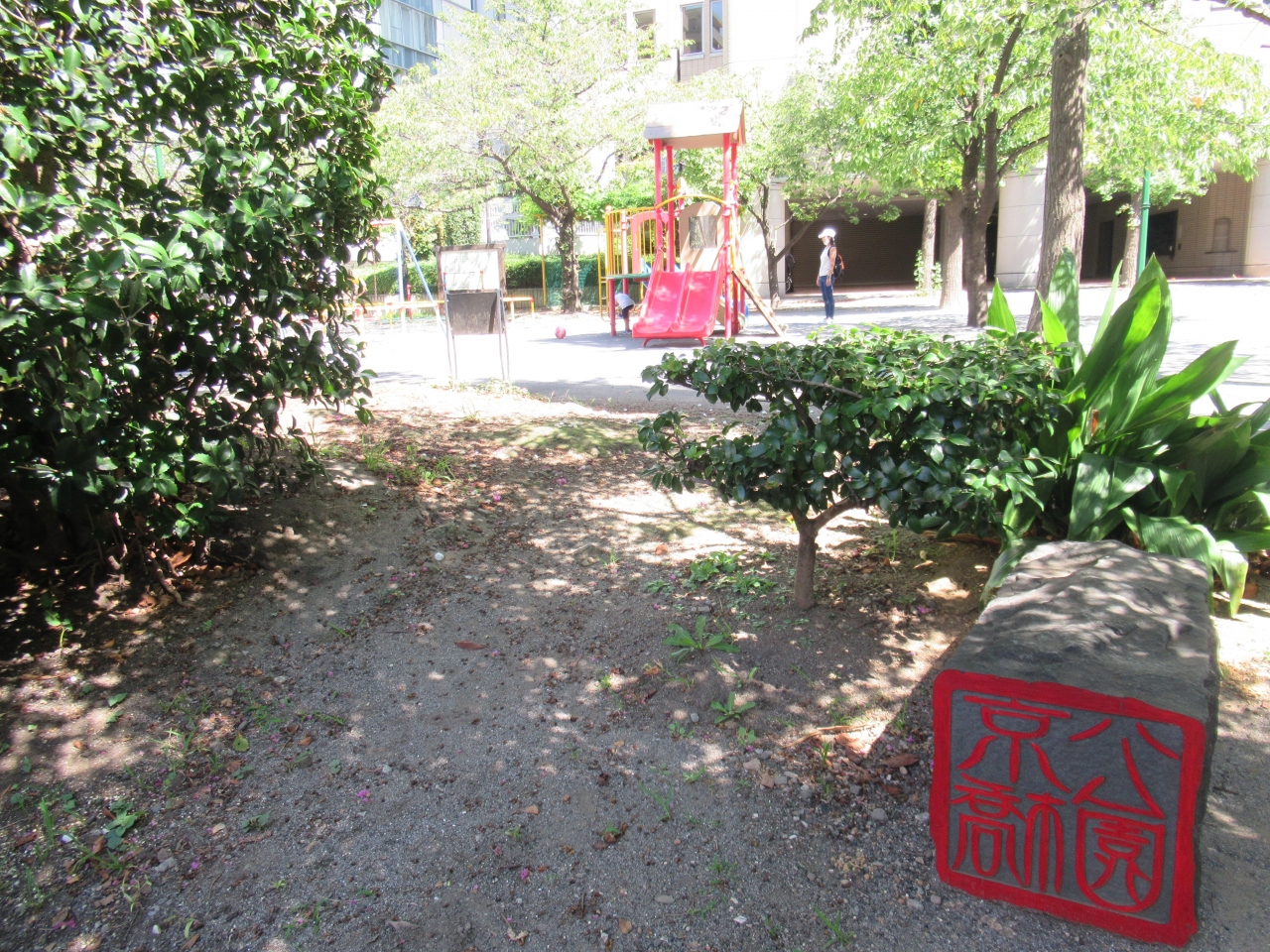 昭和通りの新京橋交差点から150mほど、京橋プラザ隣、木挽町仲通り沿いに建つ児童公園です。震災復興時に整備された歴史ある公園で、園内にはブランコや滑り台、砂場などの児童遊具が設置され、桜や柳、コブシなどが大きく生育しています。ビルの谷間に造られた、地元の人にとっては貴重な公園で、赤い文字で京橋公園と彫られたオブジェが横たわっているのが印象的でした。