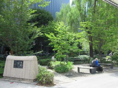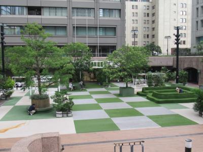 都営三田線・内幸町駅A6出口からすぐ、富国生命ビル、日比谷国際ビル、日本プレスセンタービルの3つの高層ビルに囲まれた広場です。以前訪れた時は広場内にフットサルコートが設置されていたように記憶していますが、現在は取り払われ、ビジネスマンたちがのんびりできるベンチや休憩スペースが造られています。床やベンチは人工芝になっていて、広場全体、樹木も含め緑色に統一され、働いている人たちの憩いの場にしようとする工夫が感じられます。