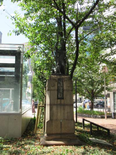 有楽町駅銀座口から5分ほど、晴海通りの両側に造られている数寄屋橋公園の東京駅側エリア、数寄屋橋交番の裏に建っています。兜を装い、松明を持った青年が獅子を従えている像で、多くの彫刻を作製した北村西望の作品です。関東大震災10周年の記念塔として設置されたそうで、台座を含め3mほどの力強さが感じられる作品です。交番の裏に建っているため目立たず、目を向ける人がほとんど見られないのが残念です。