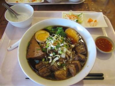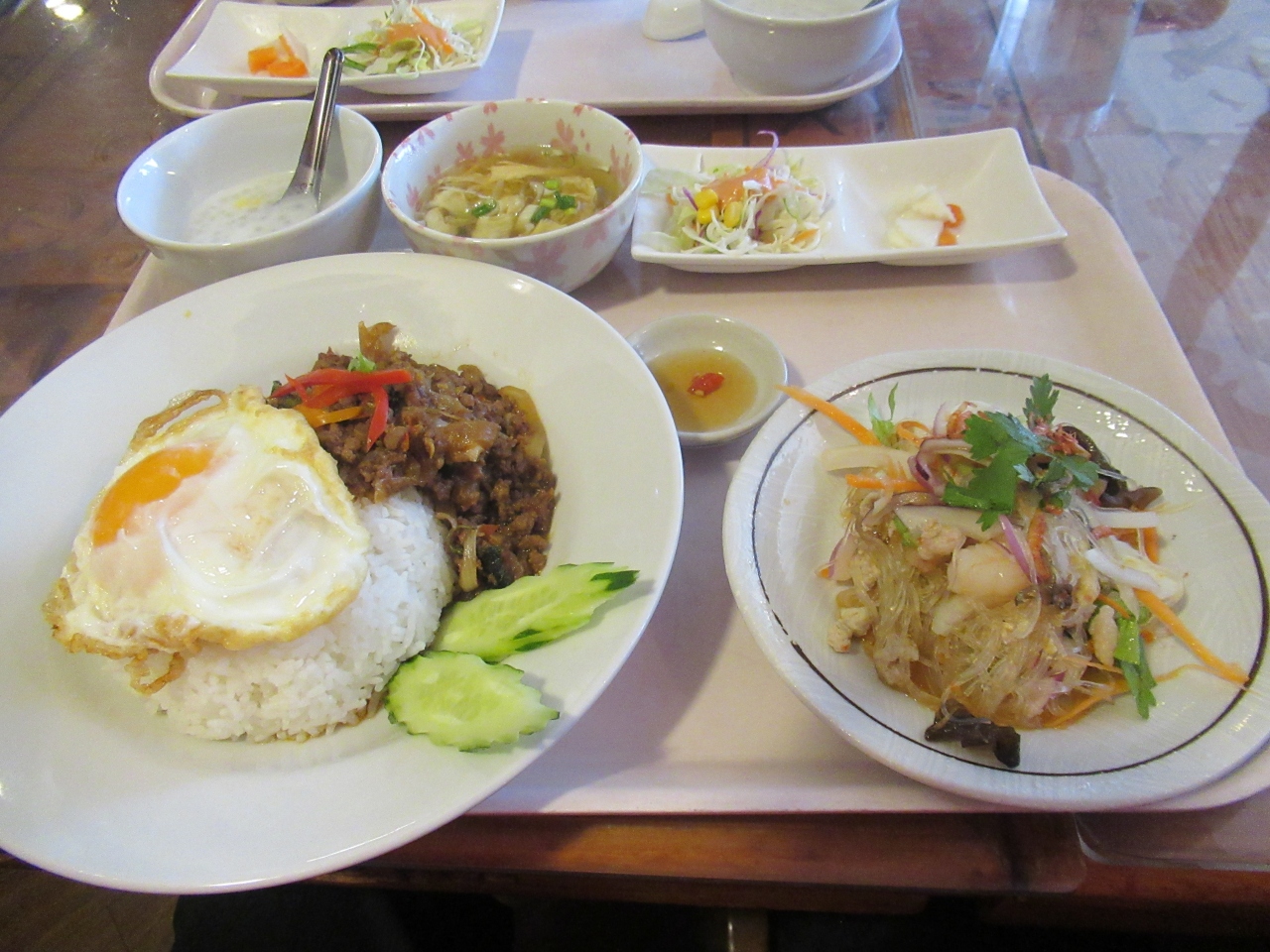 JR有楽町駅日比谷口から3分ほど、晴海通り沿いに建つ第二日比谷ビル10階にあるタイ料理の店です。本格的なタイ料理をリーズナブルな料金で食べられるため、周辺で働くビジネスマン、特に女性に人気があるようで、昼を過ぎると50席ほどある椅子は満席になってしまいます。ランチには主食にスープ、ちょっとしたサラダ、デザート、コーヒーが付いてきます。タイ人のウエートレスがタイの民族衣装を着て接客しています。店内にはタイの王様家族の写真や木彫りの彫刻が飾られ、タイの雰囲気も感じられました。辛い食事が好きな人にはおすすめのレストランです。