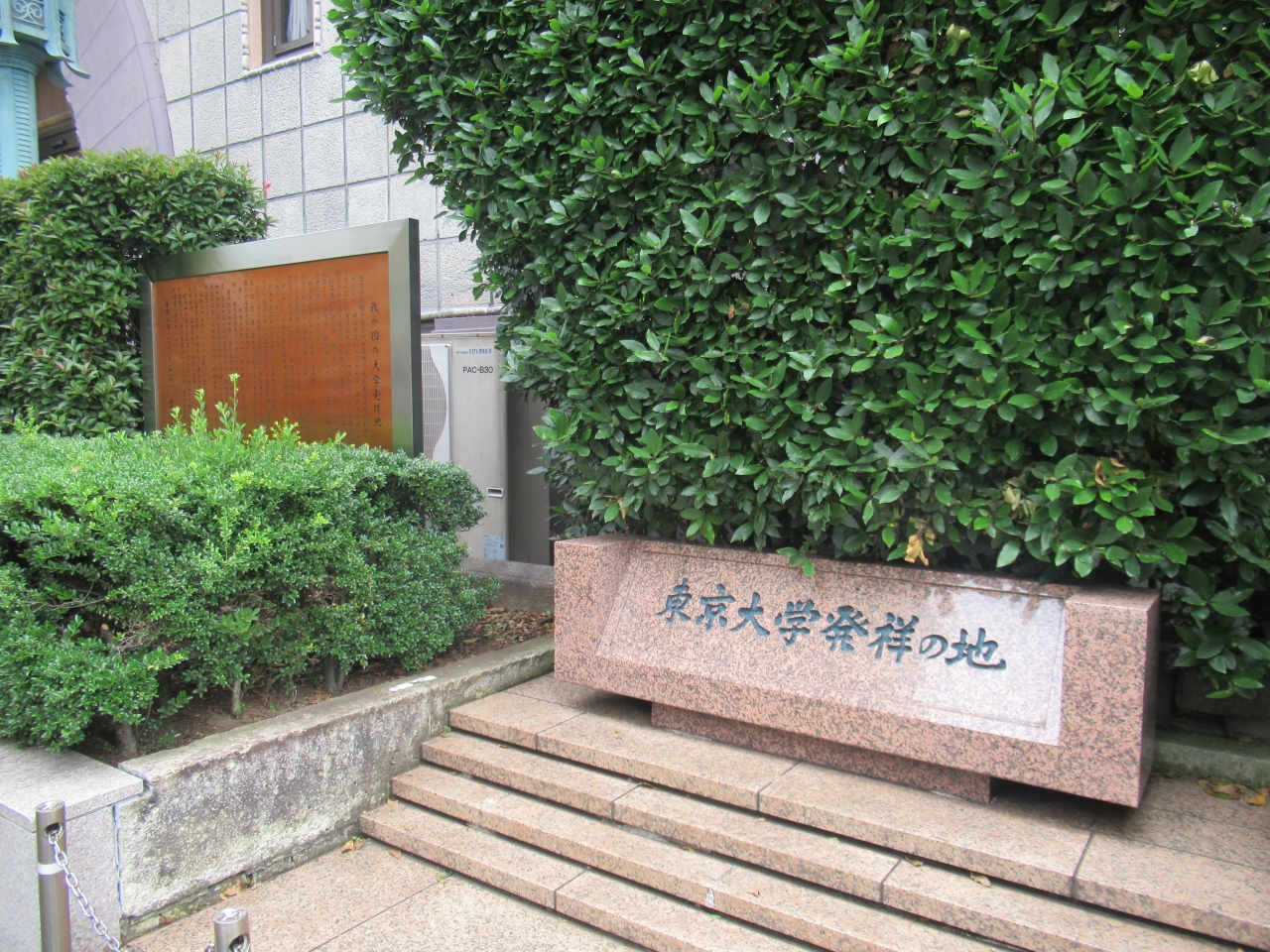 神保町近くにある学士会館の植え込みにある新島襄誕生地跡碑を見に行った際に、隣に東京大学発祥の地碑を見つけました。説明板によると、神田にあった開成学校と本郷にあった東京医学校が合併し、1877年に現在の学士会館の地に東京大学が設立されたそうです。一ツ橋近くにあることから、学士会館は一橋大学関係の建物かと思っていましたが、旧帝国大学の交流を目的とした施設だったのですね。