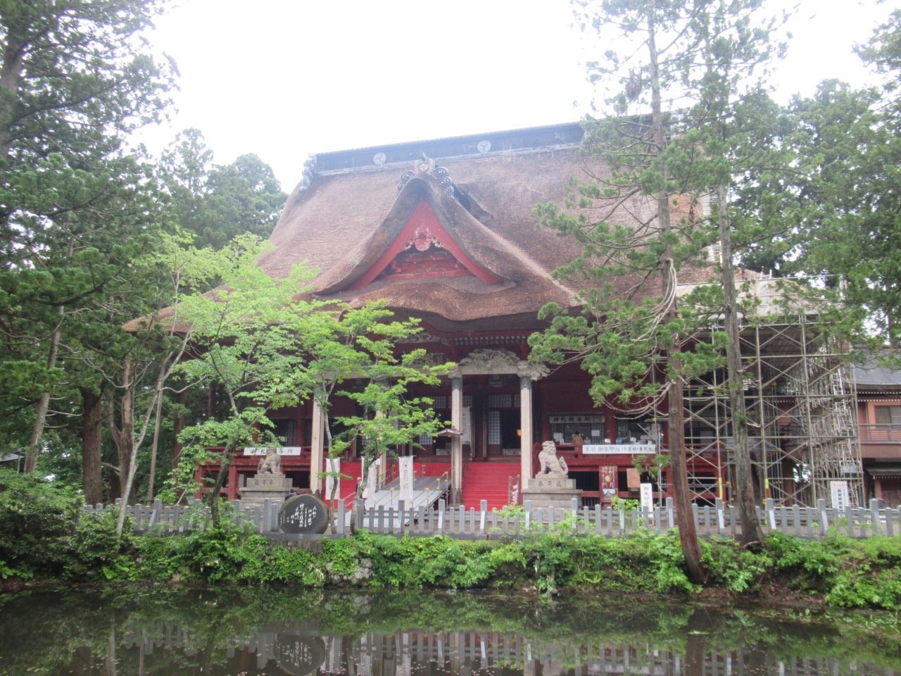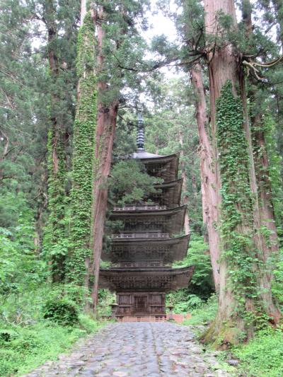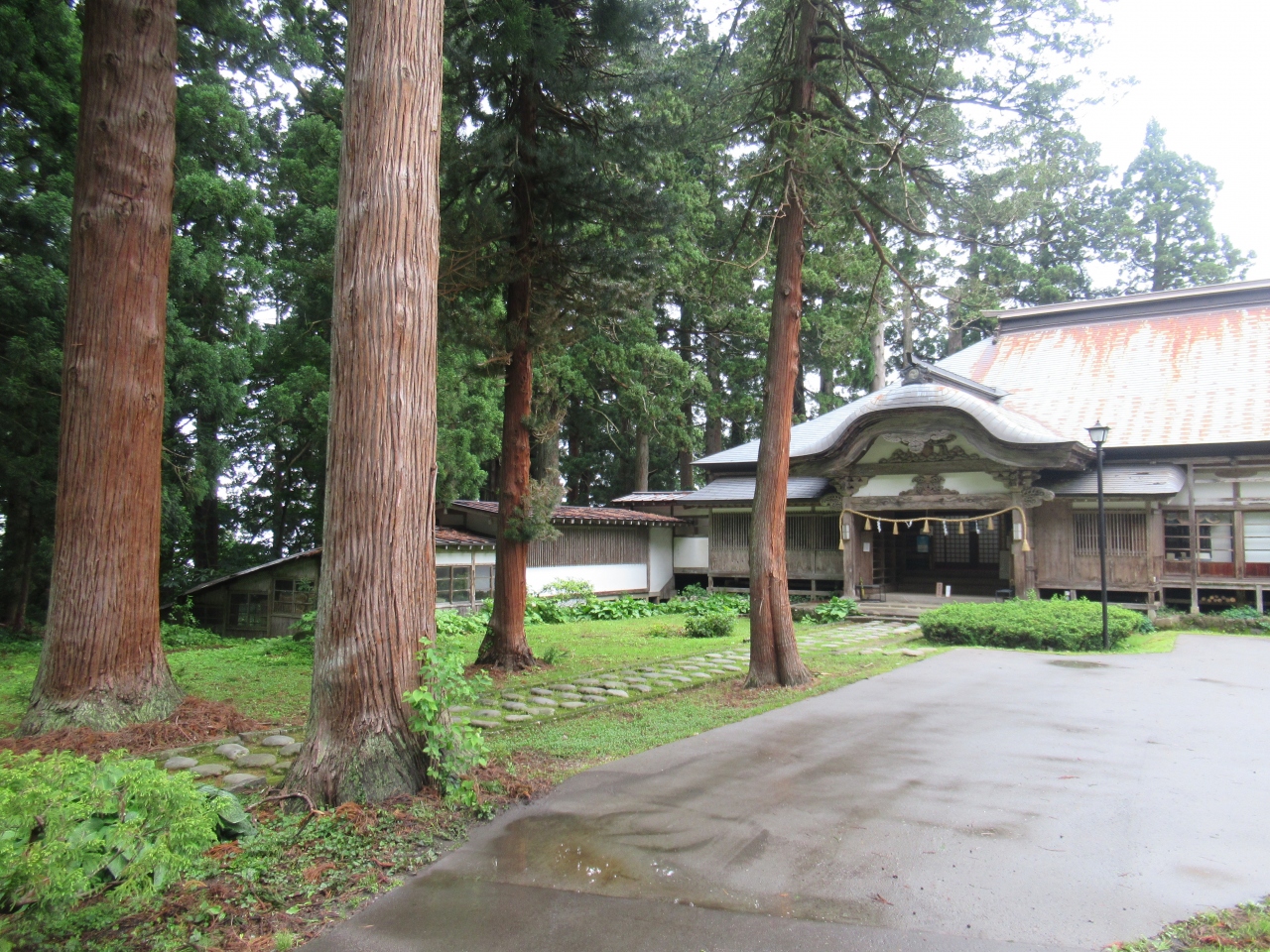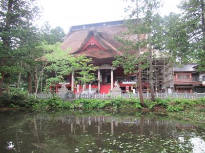 羽黒山山頂に建つ、羽黒山、月山、湯殿山の三神を祀る神社です。神仏習合時代の名残を留める造りで、厚さ2mほどの茅葺屋根が特徴の、重要文化財に指定されている建物です。すぐ近くには重要文化財に指定された、1618年に再建された茅葺屋根の鐘楼と、1275年という刻銘が入った梵鐘も建っています。どちらも汗だくになりながら、随神門から2446段の階段を上ったところに建っていることもあり、参拝できるありがたさを感じつつ、月山から引いてきた手水舎の水で心身を清め参拝しました。
