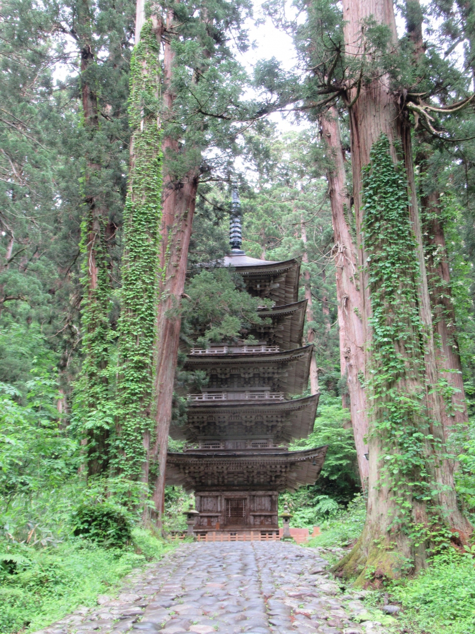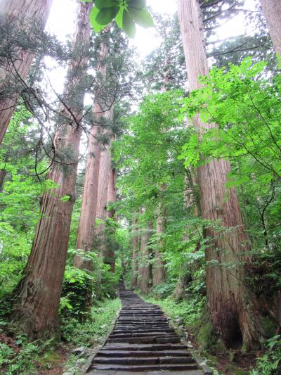 昔から修験の山として信仰されてきた出羽三山の一つです。現世の幸せを祈る山として信じられていて、山頂に建つ三神合祭殿を歩いて参拝するためには、1.7㎞の道のりにある2446段の階段を登らなくてはなりません。階段沿いには樹齢400年前後の杉並木が存在しています。羽黒山の入口にあたる随神門から国宝の五重塔に向かう途中には緑に囲まれた神橋が架かり、月山からの水が流れ落ちる須賀の滝を眺めることができます。その先には樹齢1000年ともいわれる爺杉がそびえています。汗びっしょりになりながら登り切った先には、三山の神が祀られている三神合祭殿が建ち、参拝者や修験者を出迎えてくれます。山岳信仰を垣間見ることができる羽黒山に造られた登山道です。