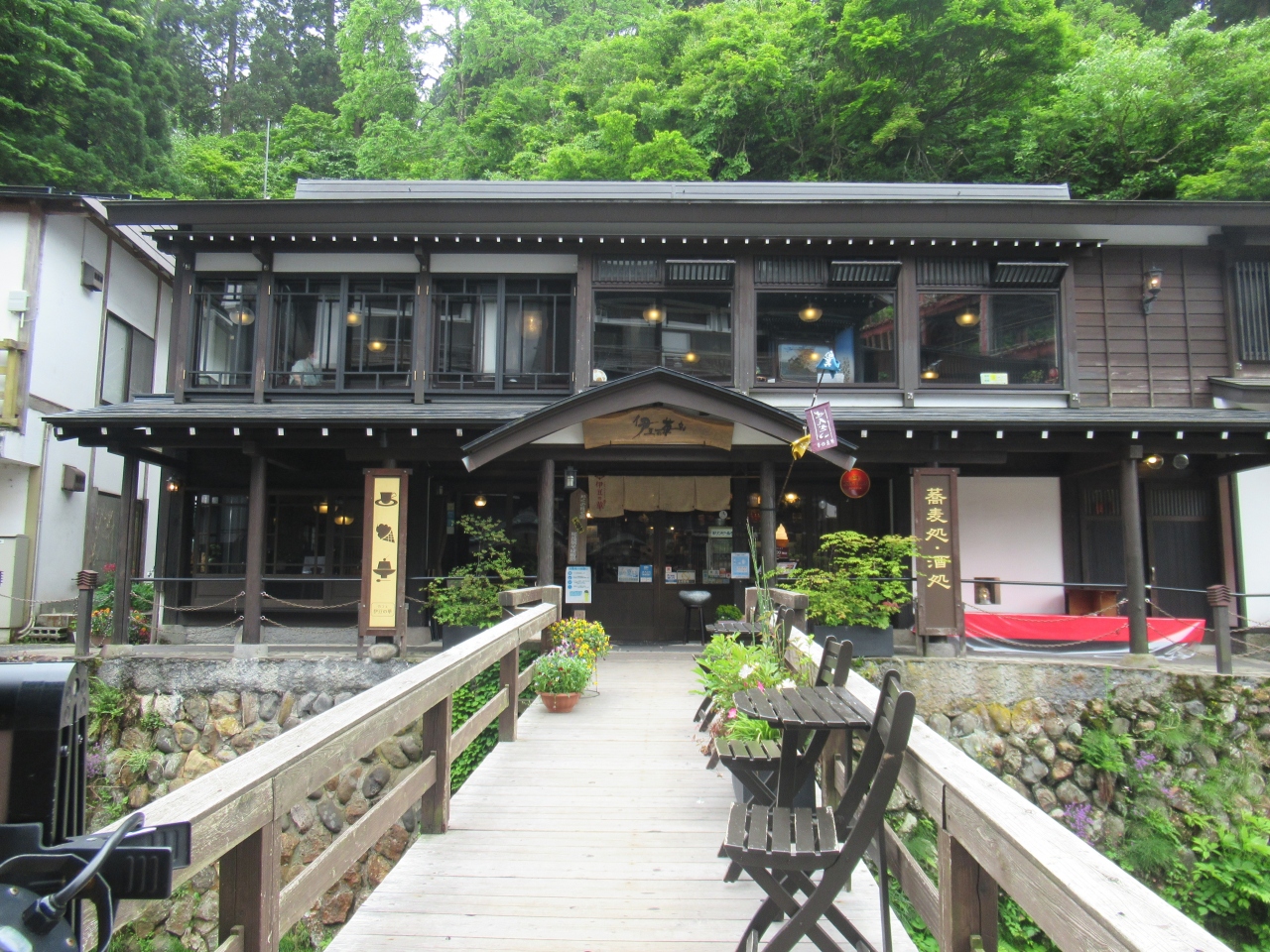 銀山温泉街に建つ蕎麦処兼カフェです。外観は周囲の旅館とマッチしていて、木のぬくもりが感じられ趣ある造りです。銀山温泉は40年程前にNHKで放送されたおしんの撮影現場でもあることから、食事のメニューには劇中で食べた大根と青葉が入った混ぜご飯・おしんめしがあります。そばは尾花沢産のそば粉を使った手打ちで、山形名物の板そばと名付けられたざる蕎麦など冷たい蕎麦がおすすめです。夜は酒処となり、ライトアップされた銀山川沿いを眺めながら時を過ごすことができます。昼頃に銀山温泉に到着した際に、腰のある美味しい蕎麦を食べるもよし、カレーパンや揚げだし豆腐で軽く済ませるもよし、色々な昼食が楽しめる銀山温泉です。