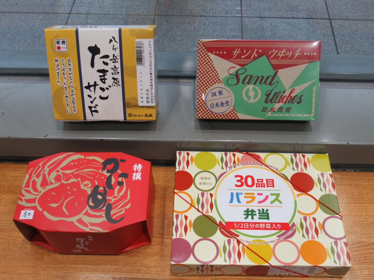 平日6時台の山形新幹線に乗るため、開店早々の駅弁屋祭で朝食と、旅先で食べる昼食を購入しました。開店前から数人が開くのを待っていました。5時半に開店し、自分たちも店内に入りました。弁当の種類は揃っていて、海鮮、牛肉、魚など食材別に弁当を選べるように並べてあります。加熱式弁当やおつまみセットなどが目をひきました。朝食用に特選かにめしと30品目バランス弁当を、昼食用に八ヶ岳高原たまごサンドとサンドウィッチを買いました。どれも美味しかったです。