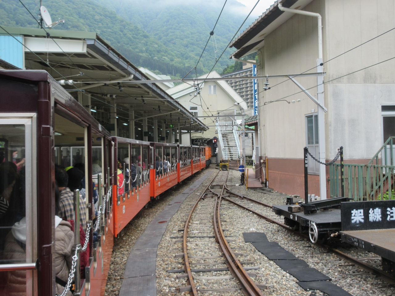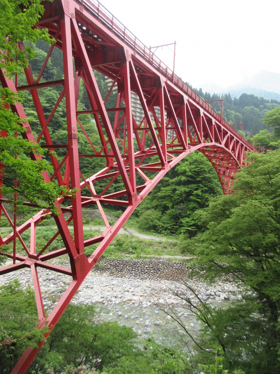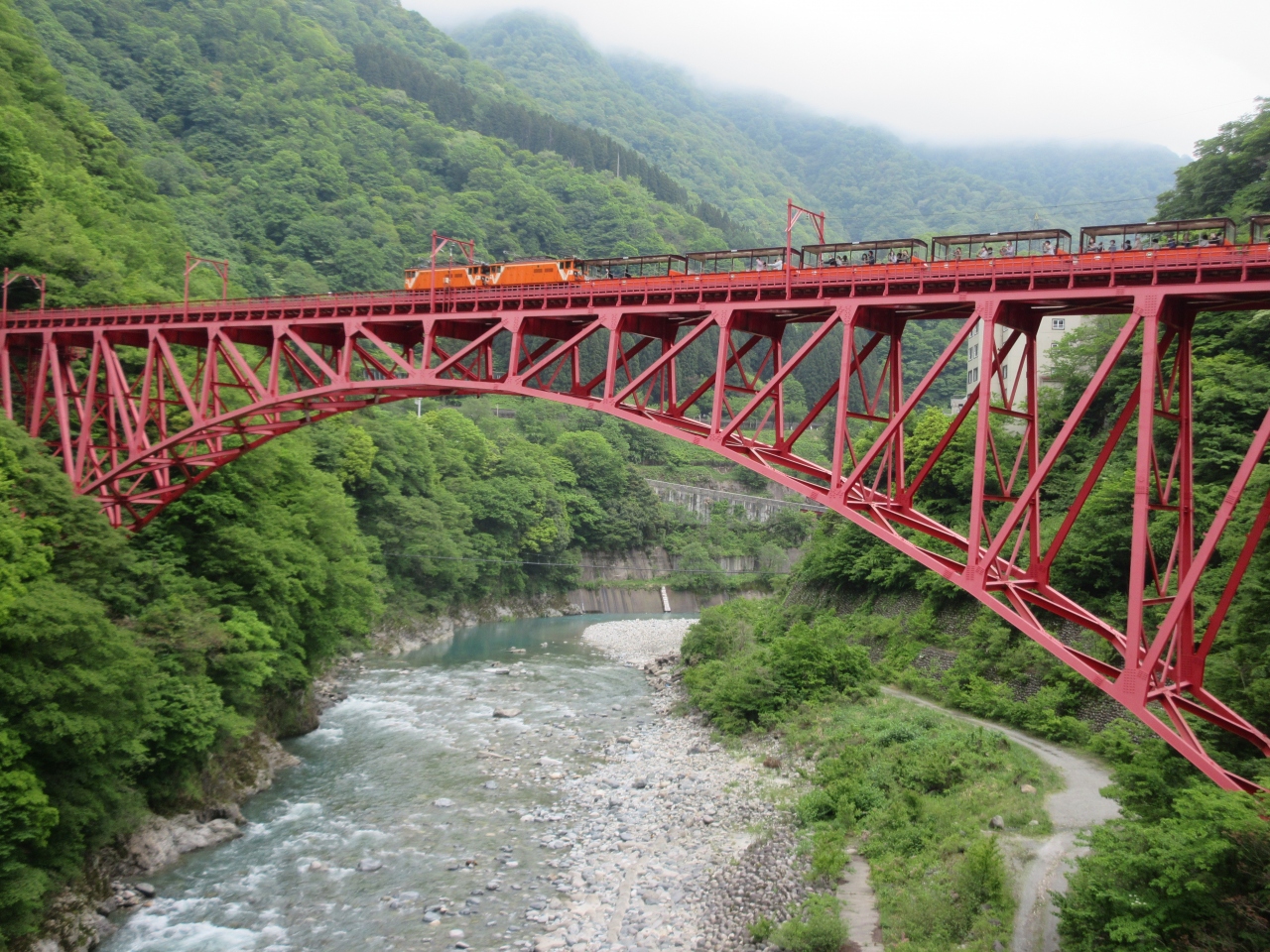 黒部の観光スポットの一つで、黒部川に発電所を建設する際の資材や作業員を輸送するために運行されていた鉄道で、現在は黒部峡谷を探勝する観光客や作業員のために運行されています。窓がない開放的なオープン型の客車と、窓付きのリラックス客車があり、どちらも緑豊かな山々と山の間を流れる黒部川、そこで生活する猿やカモシカを眺めみることができます。宇奈月駅から欅平まで乗車する予定でしたが、雪が多く笹平往復になってしまい、その分、笹平でスイッチバックの様子を見ることができました。険しい山々の残雪や野生の猿など、のんびりと自然美を堪能することができました。
