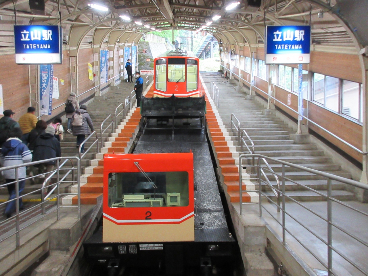 立山黒部アルペンルートに向かう際に最初に利用する交通機関です。立山・美女平間1.3㎞を7分で繋いでいます。高低差502m、最大斜度29度の斜面を一気に登る、利用者にはとても便利な乗り物です。ケーブルカーの後ろには資材や荷物を運ぶための貨車が付いているのも特徴です。
