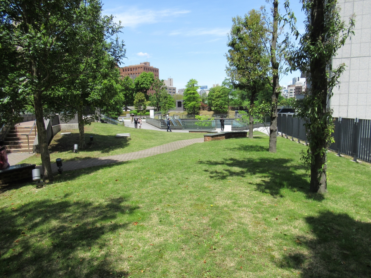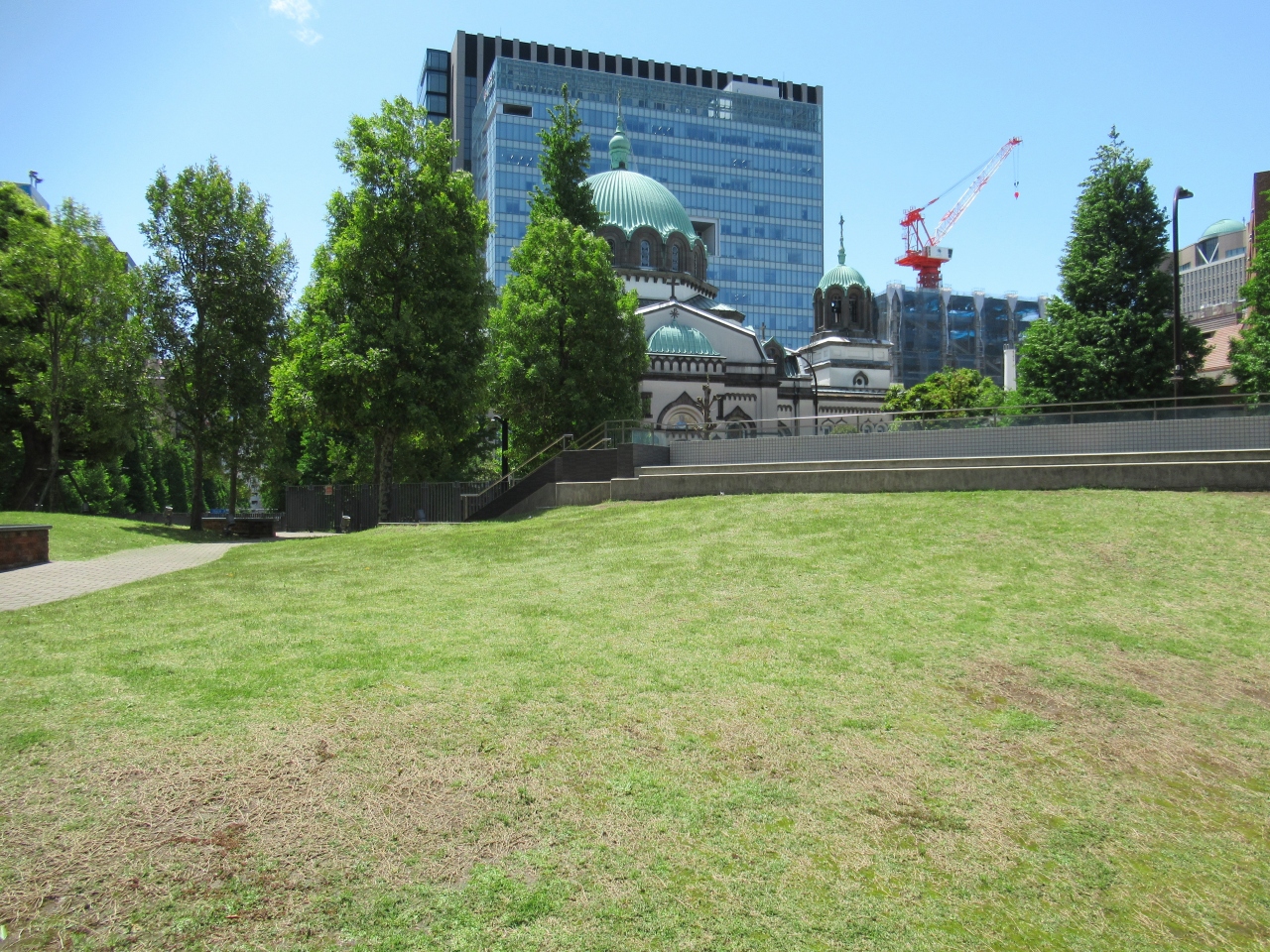 JR御茶ノ水駅の聖橋口の向かいに建つソラシティの前庭のような場所です。芝生の中にレンガ積の説明碑が立っていました。本郷通りと幽霊坂に挟まれたこの一帯は、関東大震災後に整備されたようで、昭和10年代は子どもの遊び場だったことが記されています。石積みされた上にある土地は軍艦の先端部分に似ていたから軍艦山と言われたのかなと想像を膨らませました。向かいのニコライ堂がよく見える芝生に、磨かれた石のベンチと本郷通り側にテラスがあり、ちょっとした休憩所になっています。説明碑に使われている煉瓦は岩崎彌之助邸擁壁のレンガを再利用したもので、風情があります。ビル街になった町の歴史を伝える所です。