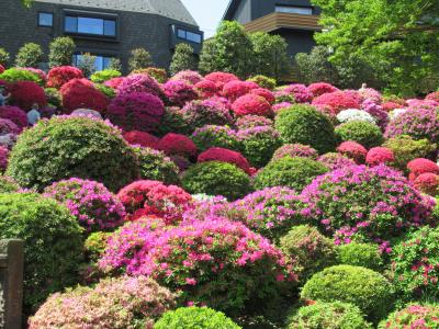 根津神社境内にある西の斜面にツツジが一面に植えられています。花が咲く期間、つつじまつりが開催されます。平日午前に訪れました。行列用のロープが入口に張ってありましたが、ほとんど並ぶことなくつつじ苑に入れました。赤を中心として、白、ピンク、サーモンピンクなどの色とりどりのツツジが咲いていました。見上げるほどの高さの木もありますが、ほとんどは目の高さの木で歩きながら観賞しました。花一つ一つを観賞するなら苑内で、斜面を覆う丸く刈りこんだ色の美しさを観賞するなら参道の神橋あたりからがいいと思います。密にならずにゆっくり愛でました。