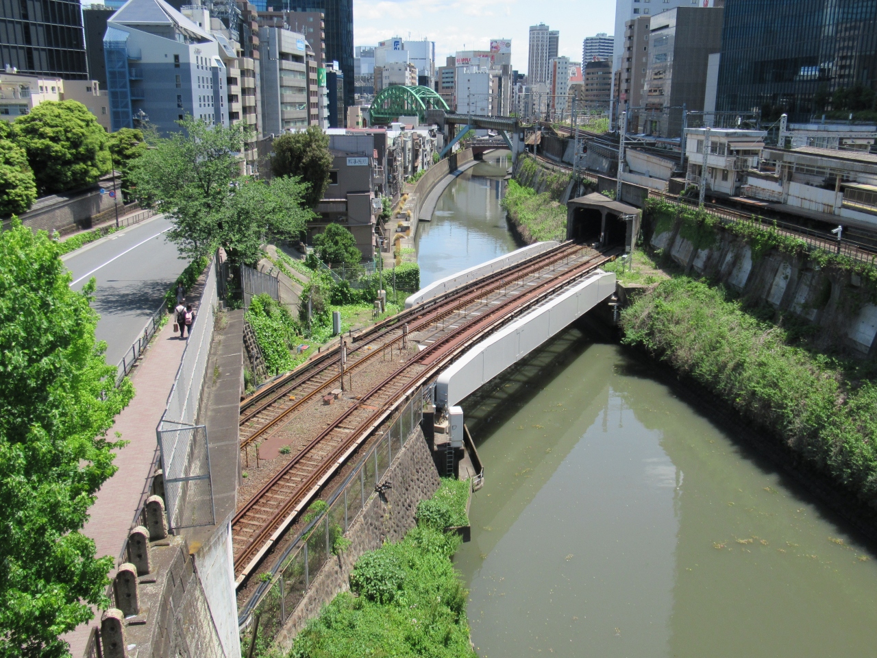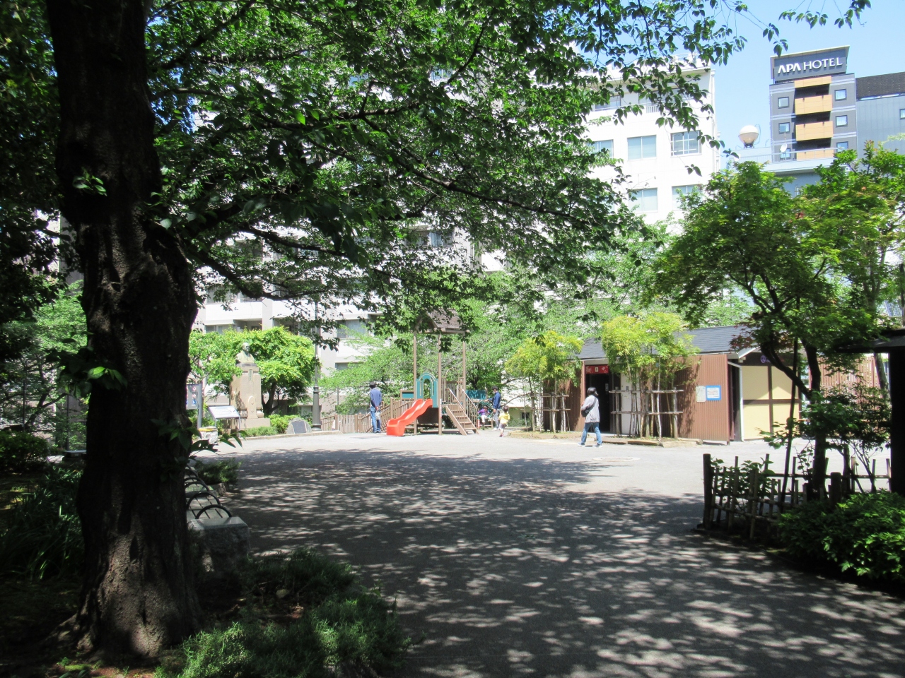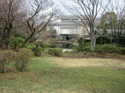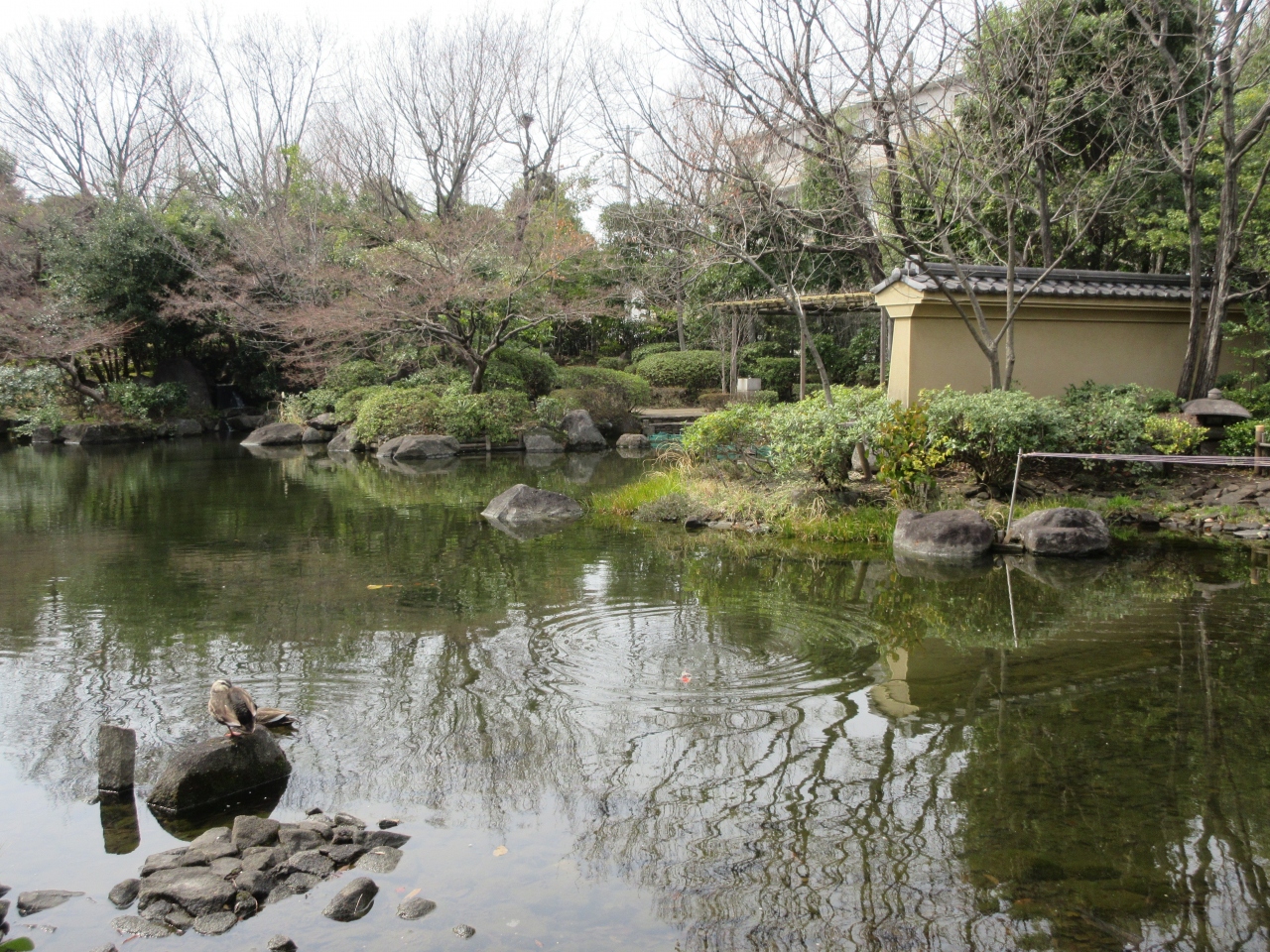 水田が多かったこの一帯に都市開発が進められ、区画整理事業により数個の公園や博物館や小学校を造りました。その際に区立郷土博物館に隣接した回遊式日本庭園が造られました。わずかな高低差を利用して川が池に流れ込むように設計されています。訪れた時、白梅がわずかに残っていて、ボケの花が咲いていました。紅葉、桜、ツツジ、藤など季節を感じられる木々が植わっています。利用可能な茶室の臨渕亭が建っています。博物館の白壁瓦屋根と庭園の組み合わせは風情があります。流れる水量が多いためか、流れる音が少し大きく庭園の雰囲気に似合いませんでした。無料で四季折々のこの景色を見られて、近くの人の憩いの場になっているのではないでしょうか。