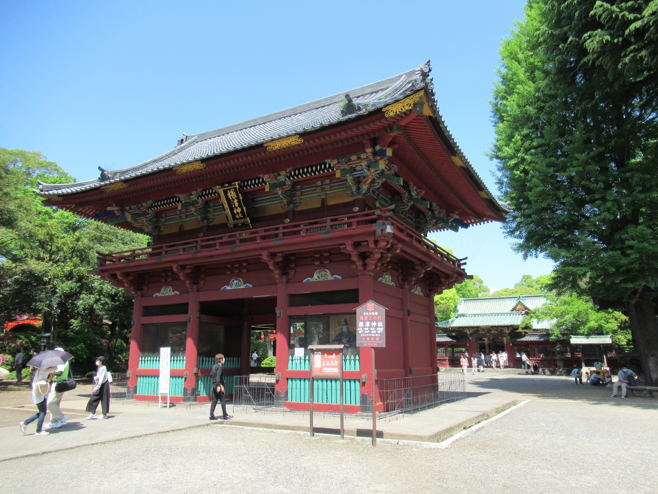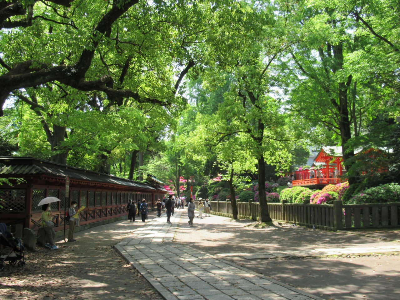 ツツジの時期に合わせ訪れました。平日だったにもかかわらず多くの花見客が鑑賞にやってきていました。つつじはほぼ満開で、入苑料を払って苑内からツツジを観賞することもできますが、神社の境内からも十分ツツジの美しさを観賞することができました。境内からはツツジ苑全体を眺められ、つつじの美しさを堪能することができました。神社内には6基の庚申塔が一つにまとまった庚申塔や、朱色の鳥居が続く乙女稲荷神社、徳川家康の胞衣塚、徳川綱重の屋敷に祀られていた駒込稲荷神社などもあり、重要文化財に指定されている本殿や銅燈籠、唐門、楼門以外にも、歴史を感じる史跡や建物が残っています。