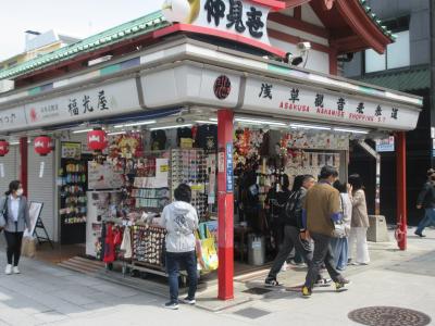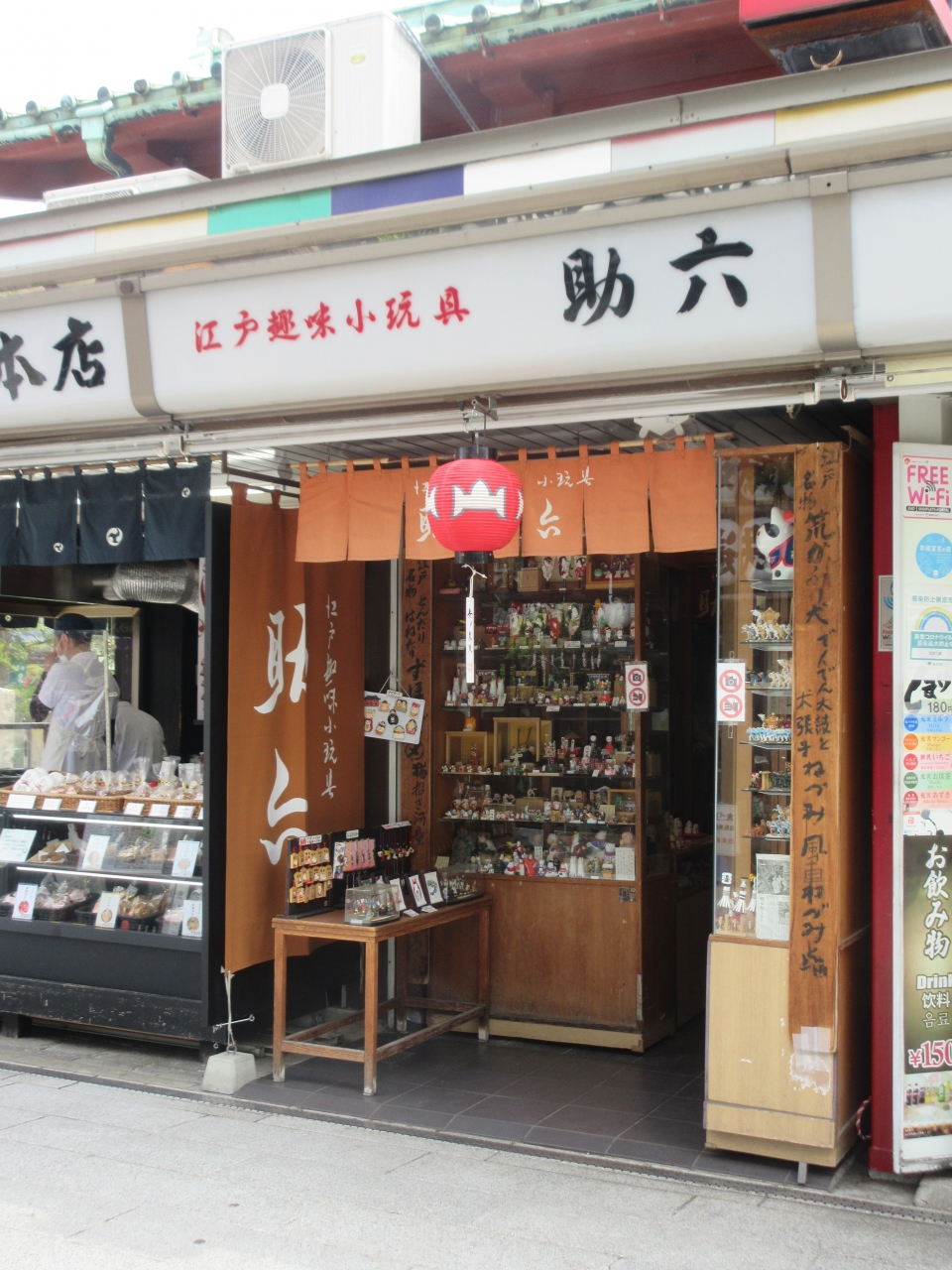 浅草仲見世沿い、最も宝蔵門近くに建つ、小物類を売っている店です。でんでん太鼓や風車などの日本古来のおもちゃや、祭りの様子や演芸の舞台、江戸時代の職人の姿などを表現した小さな手作り模型などが、所狭しとウィンドーの中に飾られていました。中にはくぎを使わずに作られた10㎝ほどの高価な羽子板も並んでいました。どれも細かく精巧で色鮮やかに作られていて、それぞれ趣がありじっくり見たくなる作品ばかりです。