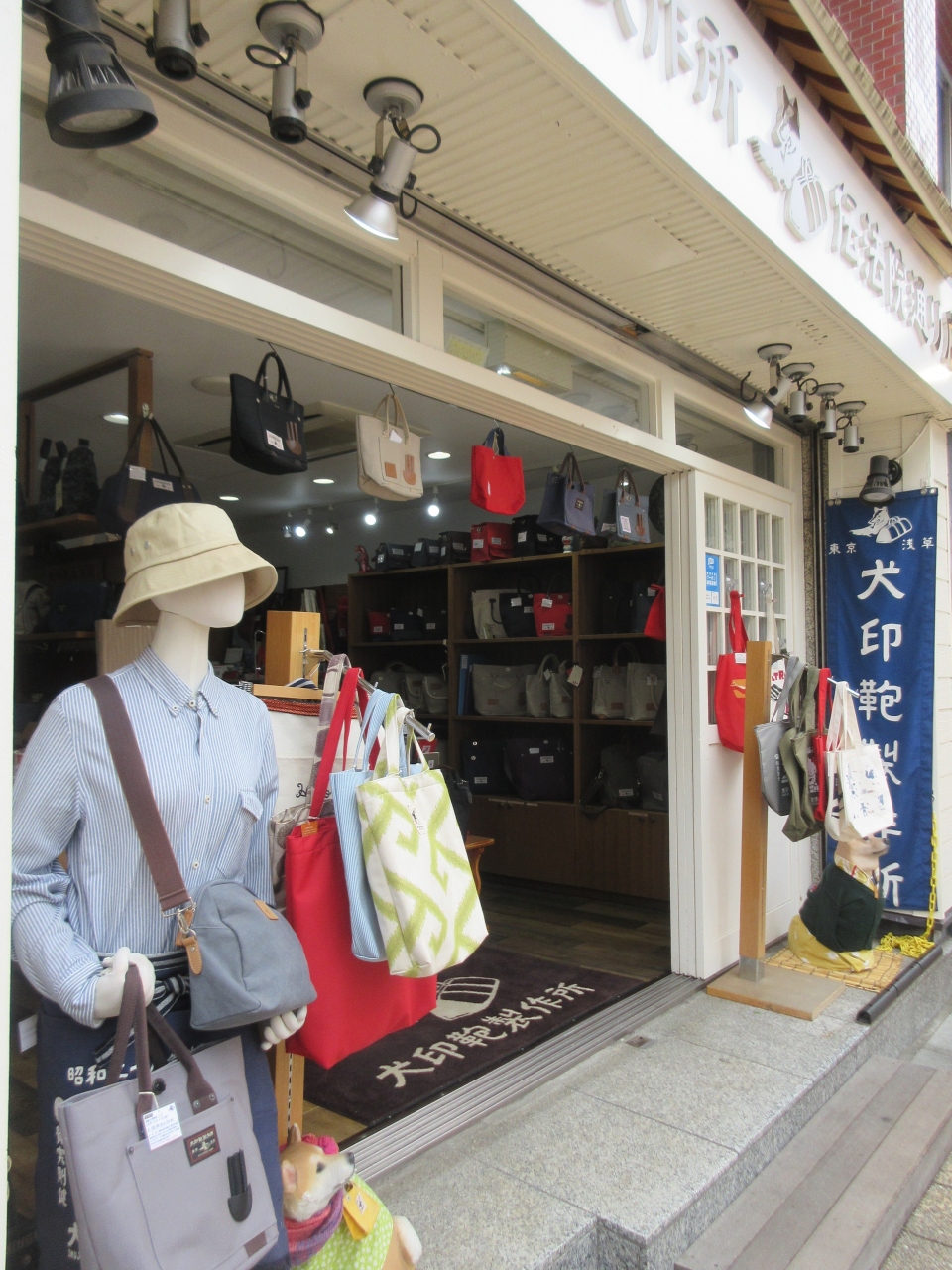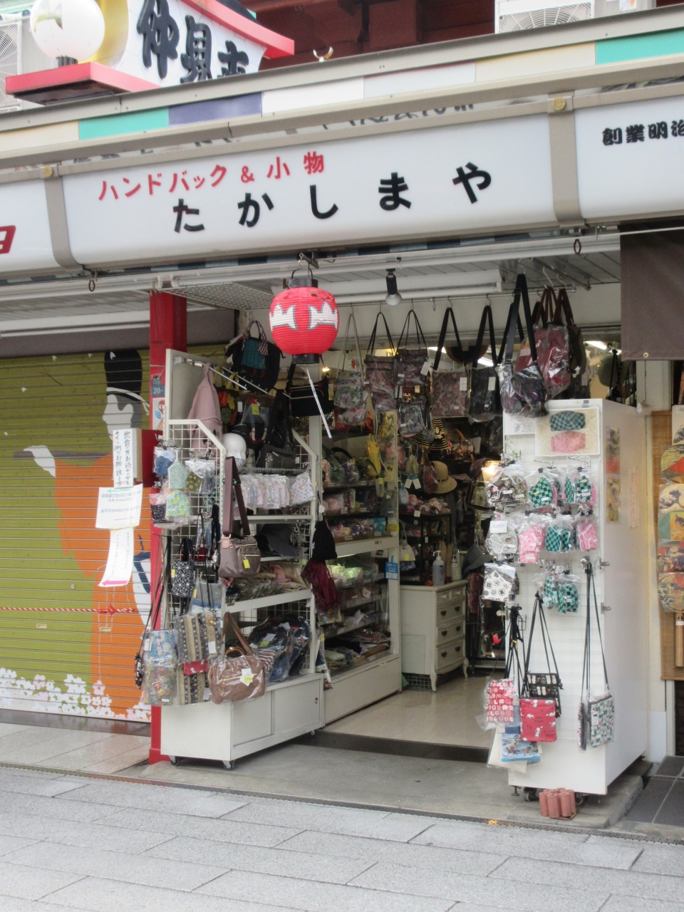 伝法院東通り沿いに建つ、昭和28年創業の布鞄の店です。店内には帆布で作った手さげ鞄や、肩掛け鞄、旅行用の大きなカバンなど、色々な種類の異なった大きさの鞄が並んでいて、自分だけの一品を探すことができます。色々な色のブックカバーも販売されていました。値はやや張りますが、しっかりした軽くて強い布で作られているので、使い込むほど味が出てきて長持ちします。かっぱ橋にも姉妹店がありますが、ドアが閉まっていて入店しにくく感じましたが、こちらの店はドアも窓もなく開放的で入店しやすく感じられました。