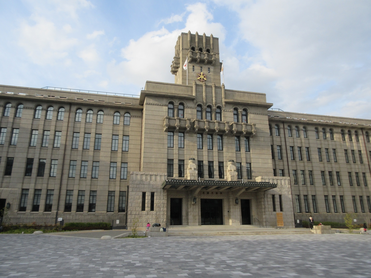 京都市役所前駅そばの建物です。1927年に東側が、1931年に西側が完成しました。地上4階、地下2階建てで、関西近代建築の父と言われた武田五一監修の建物です。観光で市役所を訪れることはありませんでしたが、バスの車窓で立派な建物に興味を持ち、今回初めて訪れました。すっきりとしていながら堂々とした建物は改修されながら使われています。政令指定都市の市役所のなかで古くからある建物として知られています。本館前の広場に姉妹都市8都市から贈られた像やモニュメントがあります。キーウ献花台があるのが印象的でした。