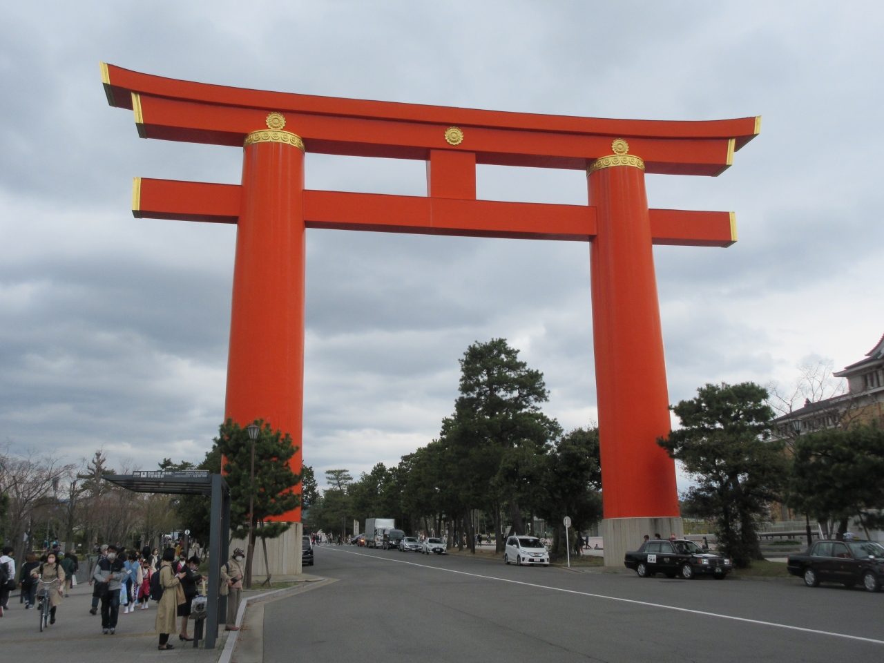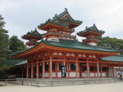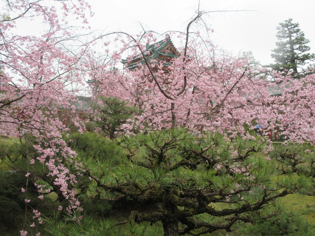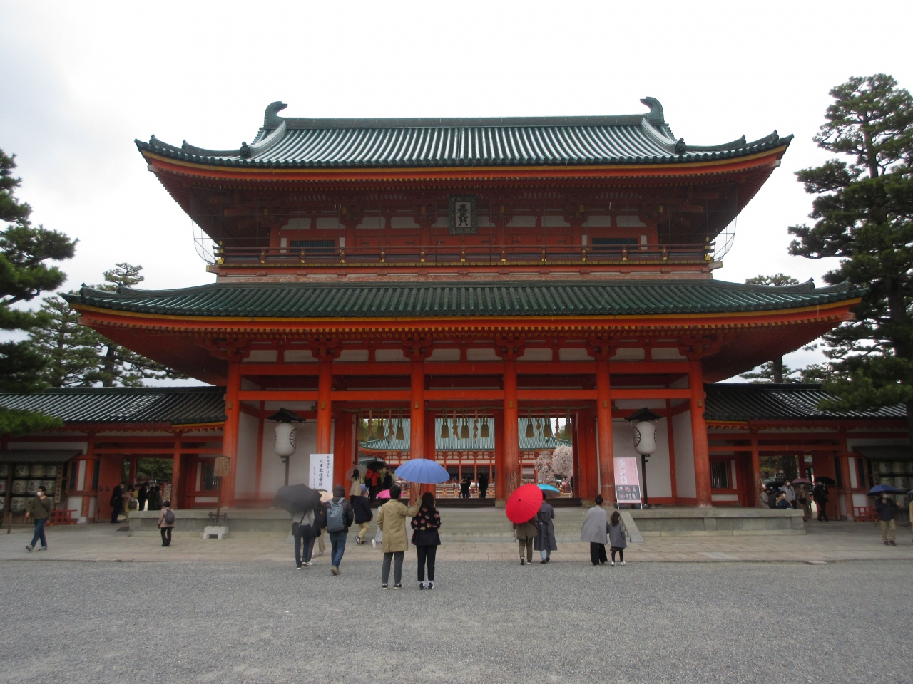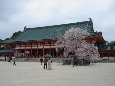 琵琶湖疎水のそばに高さ24mの朱色の大鳥居が建っています。参道の先に建つ二層の應天門をくぐると1895年創建の本殿があります。桓武天皇を祭神に、1940年に孝明天皇を合祀しています。建造物はいずれも平安宮や平安京の建物を復元しています。本殿の後ろに広がる神苑に入りました。あいにくの雨でしたが、しだれ桜が美しく、4つの神苑を歩きました。桜越しに見る回廊の屋根や広い池に架かる橋殿の美しさを観賞しました。披露宴会場の華やかな様子を遠くから見たり、應天門前の参道で開催されていた京都さくらよさこいの踊りを見たりして観光しました。