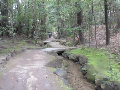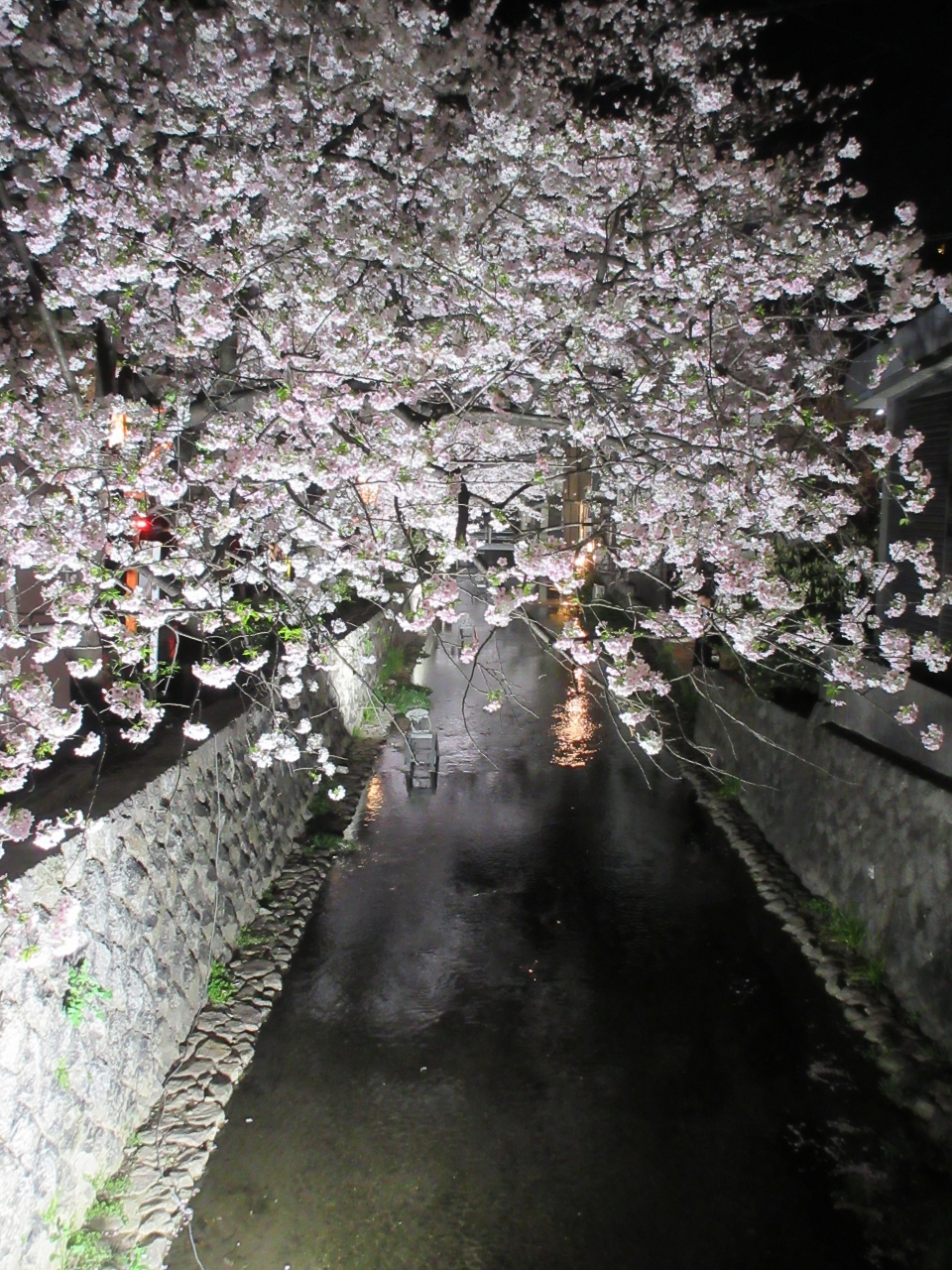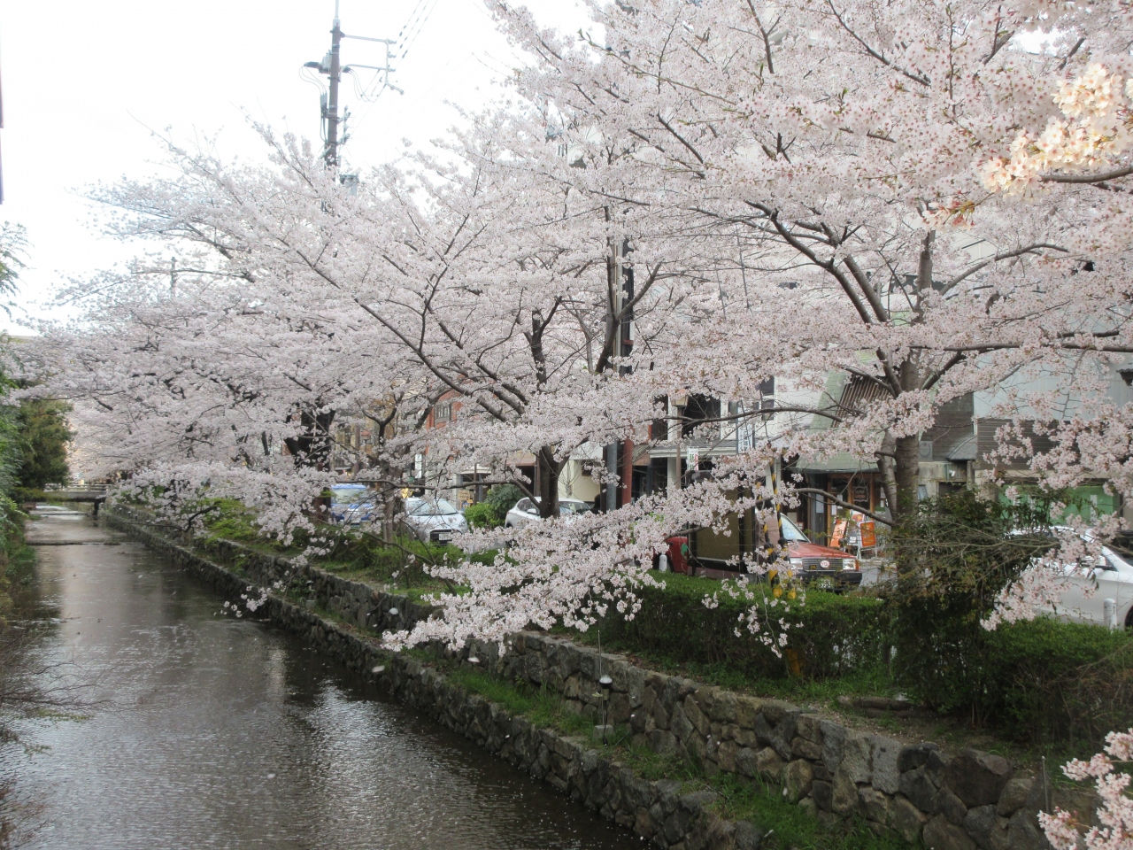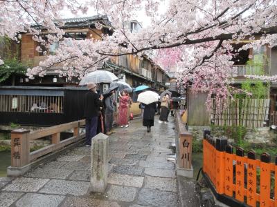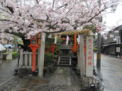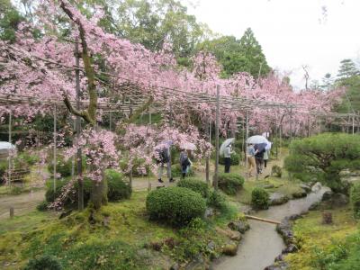 琵琶湖疎水のそばに高さ24mの朱色の大鳥居が建っています。参道の先に建つ二層の應天門をくぐると1895年創建の本殿があります。桓武天皇を祭神に、1940年に孝明天皇を合祀しています。建造物はいずれも平安宮や平安京の建物を復元しています。本殿の後ろに広がる神苑に入りました。あいにくの雨でしたが、しだれ桜が美しく、4つの神苑を歩きました。桜越しに見る回廊の屋根や広い池に架かる橋殿の美しさを観賞しました。披露宴会場の華やかな様子を遠くから見たり、應天門前の参道で開催されていた京都さくらよさこいの踊りを見たりして観光しました。