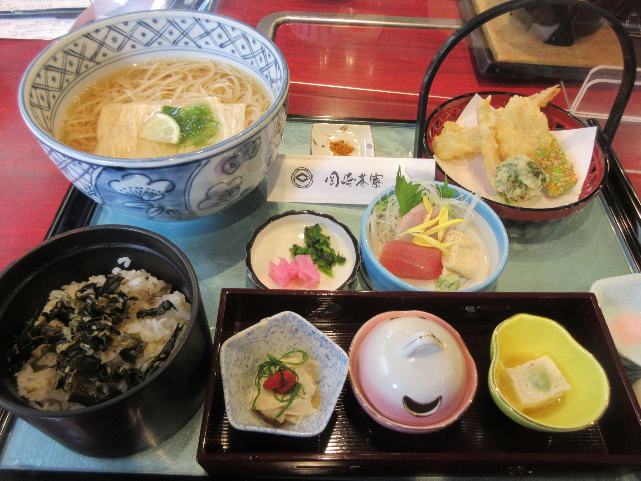 岡崎道と京都市動物園の南の琵琶湖疏水を渡った交差点にあります。休日観光してゆっくり昼食をとる店を探していた時に、開店したばかりの岡崎茶寮を見つけて入りました。生け簀が店内にある広い食事処です。御膳や会席料理などがあり、個室に法事料理の準備がされていました。座敷掘りごたつ席に通されました。京風稲庭うどん御膳と京生麩ゆば玉子とじ膳を注文しました。刺身、天ぷら、湯葉、稲庭うどん、ご飯などボリュームのある御膳はあっさりした稲庭うどんが気に入りました。生麩と湯葉好きの妻が頼んだ玉子とじ膳は、生麩と幅広い湯葉の鍋に溶き卵をかけてとじ、ご飯にのせて食べる料理でした。さっぱりとしていて雑炊のように汁も一緒にかけて食べました。観光で少し疲れていた体にしみる美味しさとゆっくり休めた昼食でした。