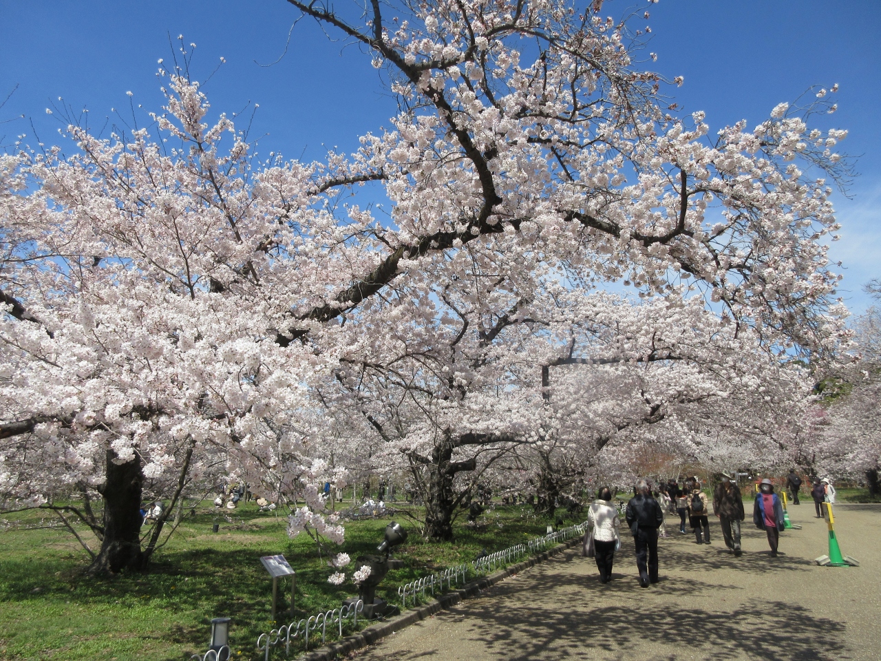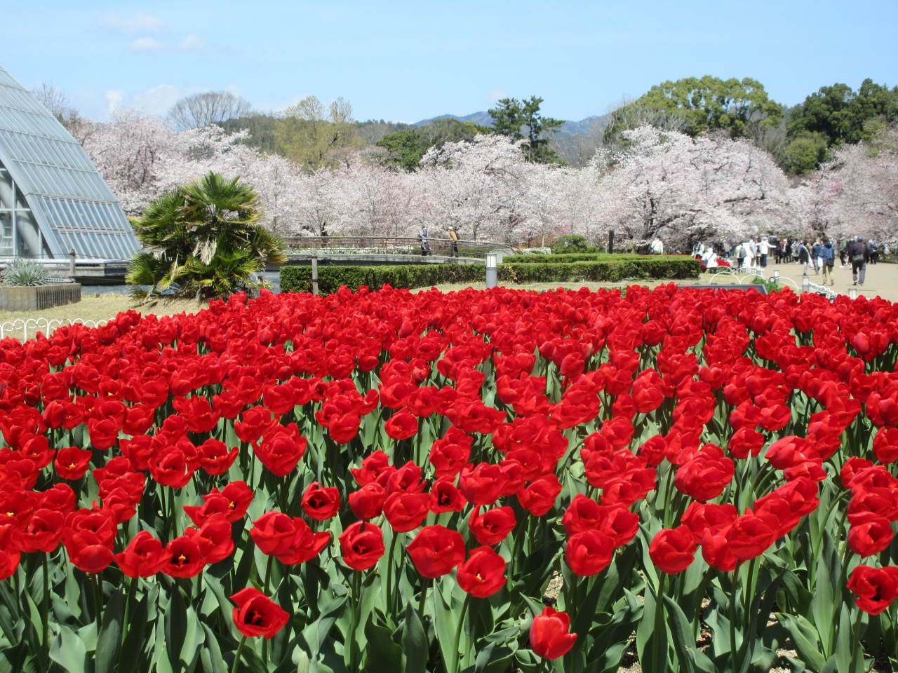 地下鉄烏丸線北山駅脇に北山門が、植物園前バス停から5分ほど道なりに北へ歩いたところに正門があります。正門から入り、チューリップの花壇や桜林を見ながら歩き、森のカフェで昼食をとりました。半木神社や絶滅危惧種を見て、針葉樹林と咲き終わったツバキの間の道を歩き、北山門から出ました。訪れた平日昼、大芝生地でシートを敷いたり、テーブルやイスを利用したりして弁当を食べている人たちがいました。桜の花見をする市民や観光客で賑わっていました。園内は広く、次の観光予定がなければゆっくりまんべんなく歩きたかったです。