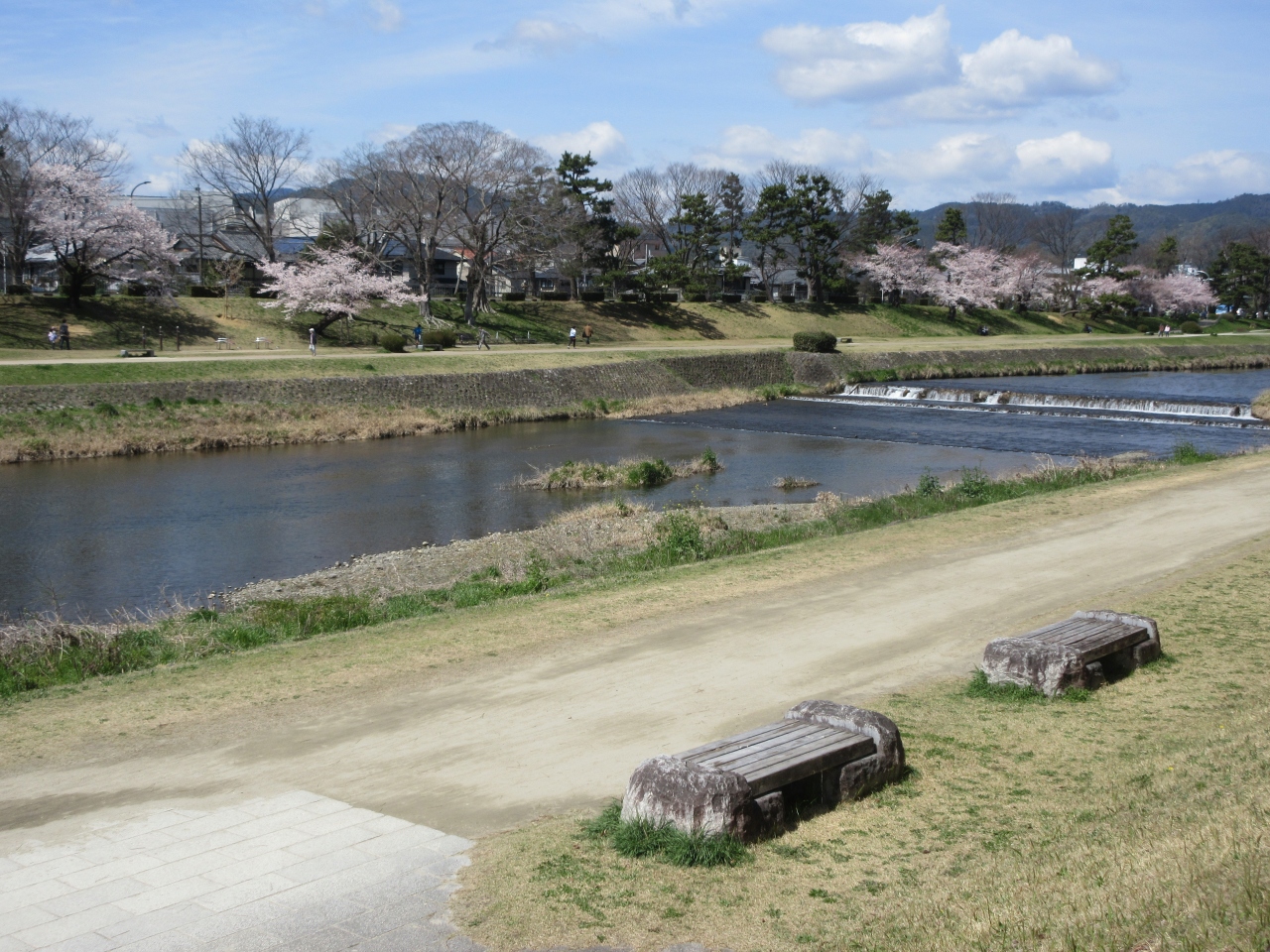 京都府立植物園へ行った時、植物園前バス停から賀茂川沿いに正門まで歩きました。川沿いの遊歩道にベンチがあり、健康器具が設置されているところもありました。桜が咲いていてのんびり川沿いを散歩するのに適した遊歩道です。上賀茂神社に行った時に御薗橋が架かる賀茂川沿いに桜の木々があり、きれいに咲いていました。京都に来た時は神社仏閣庭園巡りをして、賀茂川沿いをゆっくり歩くことがありません。桜の時期に来たので、川の流れを聞き、桜を見ながら散歩する旅をしてみたいと思いました。ドラマや旅番組でよく見る賀茂川ですが、流れの音が大きかったのは意外でした。