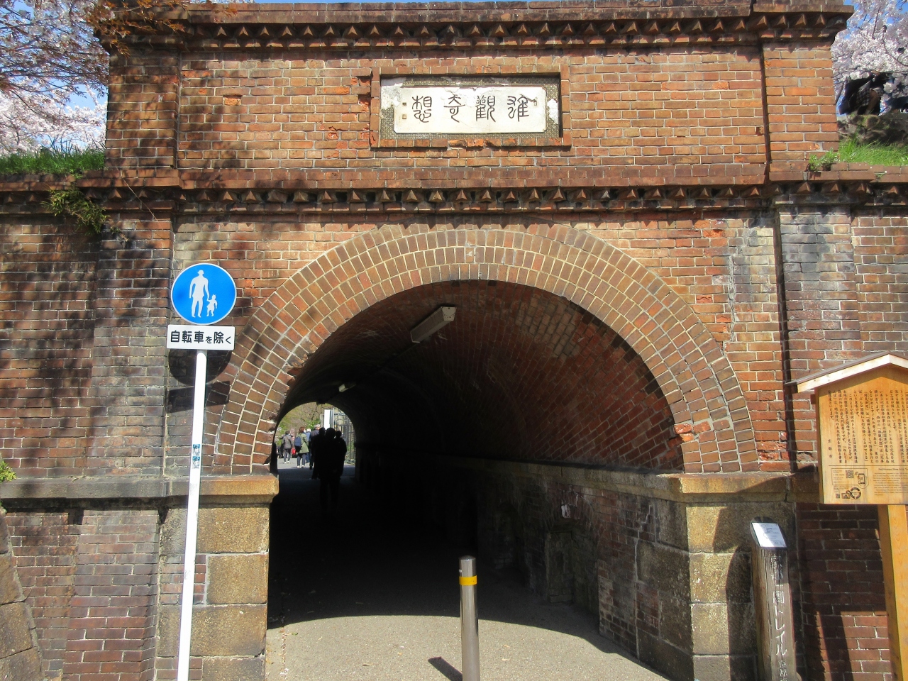 蹴上駅近くにある煉瓦のトンネルです。三条通から南禅寺へ抜けるトンネルで、ねじりまんぽはねじりのあるトンネルという意味です。トンネル口にある扁額は1888年トンネル完成を祝い当時の京都府知事によるものです。説明板にトンネル建設とねじりの意味などについて記しています。年月の経ったレンガ組みは見ごたえあるものです。蹴上インクラインを見に行く際に注目したいです。