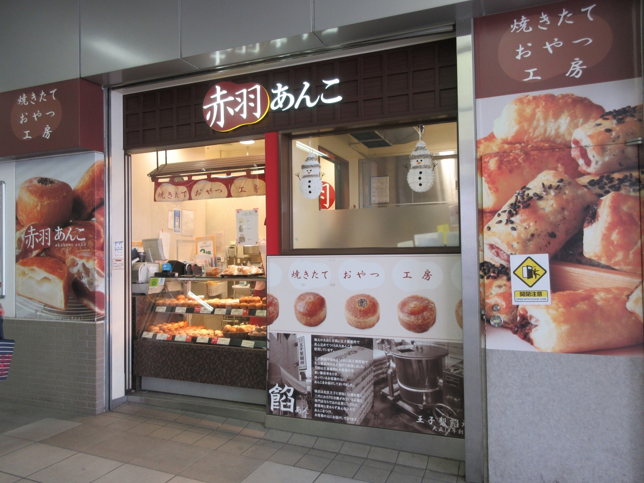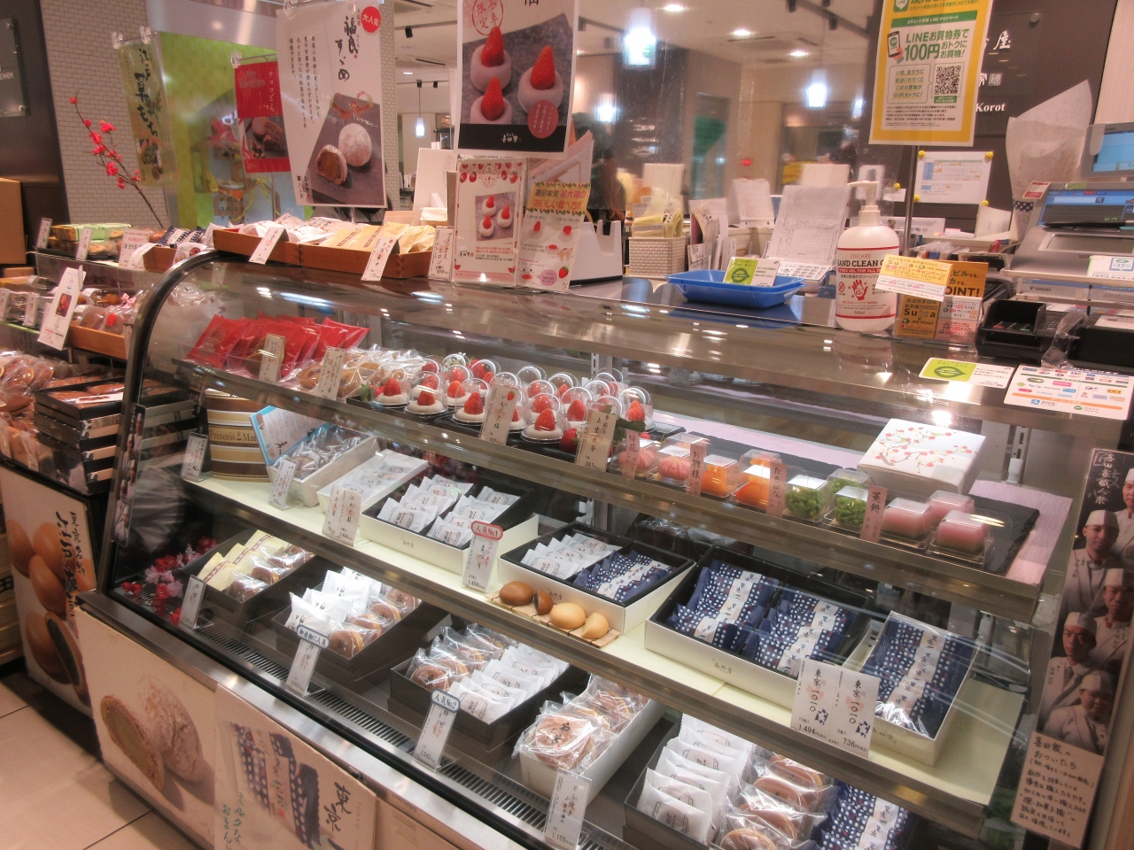 JR赤羽駅構内にあるエキュート赤羽にあります。バレンタインデー間近の休日午前に駅を降り、スイーツを探しに寄りました。和菓子専門店で、日持ちするどら焼きやまんじゅうや最中などがあります。和菓子の他店同様、いちご大福がありました。ふっくらしたかわいらしいいちご大福です。隣に上生菓子が並んでいて華やかなショーケースでした。チョコどらがあるのも特徴です。