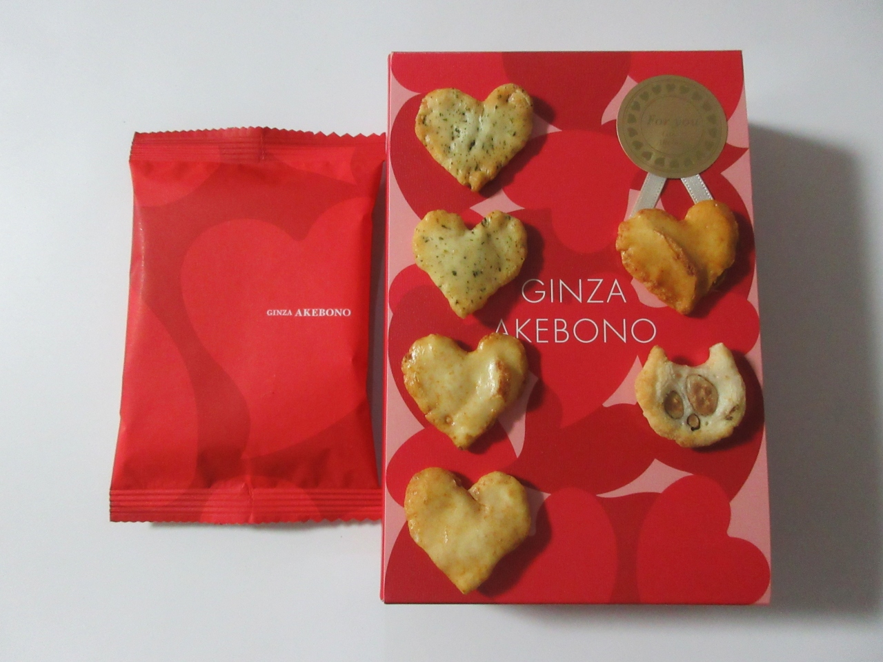 銀座に本店を持つ和菓子と煎餅の店です。バレンタイン間近に、息子の嫁から小箱に入った義理チョコならぬ義理あられ煎餅をもらいました。箱の中に入っていた小袋には、ハートの形をした醤油味や青のり味、アーモンド味、チーズ味のあられ煎餅が入っていました。チョコレートが苦手な自分にとっては、とてもうれしいプレゼントでした。今の世の中、チョコレート店のみならず、色々な店でいろいろなバレンタイン商品を開発、販売していることにちょっと驚きました。