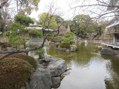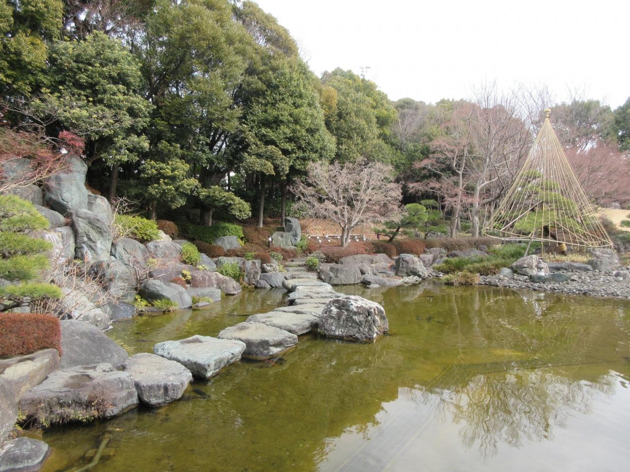昭和57年に足立区区政50年を記念して造られた、池泉回遊式日本庭園です。庭園全体、大名屋敷の庭園のような造りになっていて、庭園は白壁や木造の門、石垣に囲まれ、庭園内には大きな雪見灯籠や四阿、岩から流れ落ちる滝、雪吊りなどが配置されています。池を囲むようにして造られている遊歩道は、木々の手入れが行き届いていて、気持ちよく散歩することができました。庭園隣に造られた花畑公園には芝生広場や児童遊具、健康器具などが設置され、公園を囲むようにして100本ほどの幹が太く枝が広がった桜が植えられています。桜の季節には庭園と公園をのんびり散策することをおすすめします。