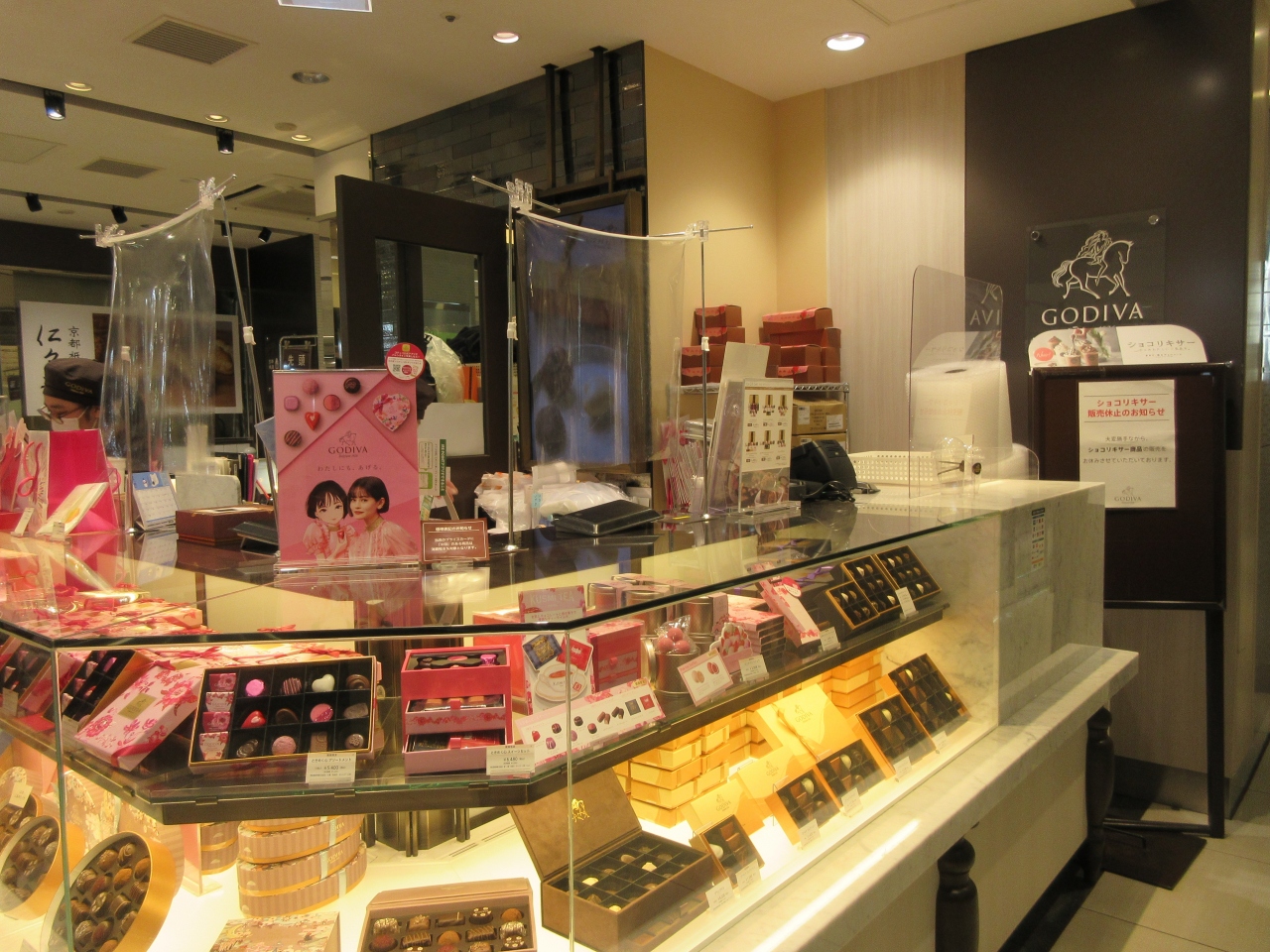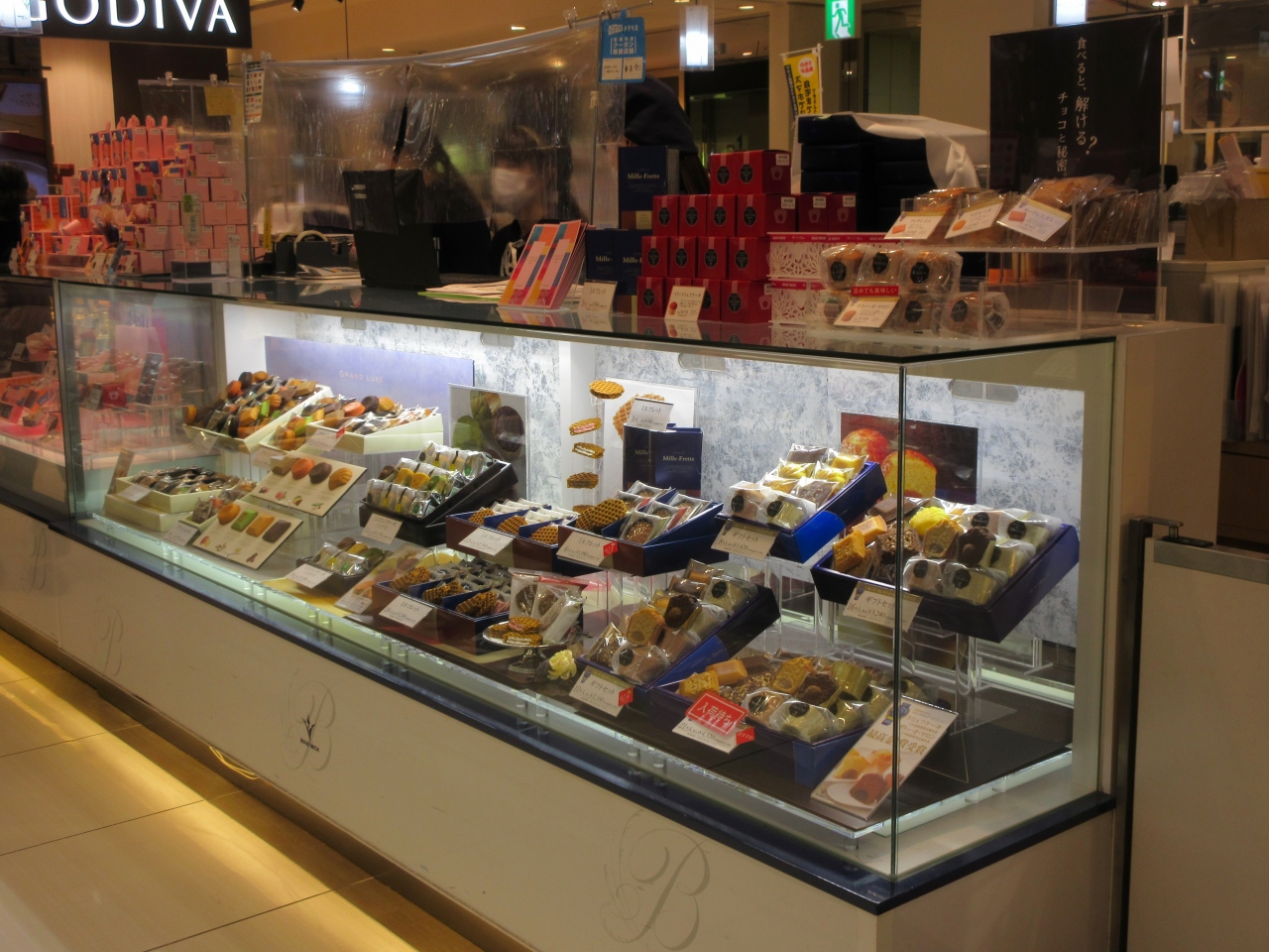 JR赤羽駅構内にあるエキュート赤羽にあります。バレンタインデー間近の休日午前に、スイーツを探しに寄りました。チョコレートを扱う洋菓子店が並んでいてどこも女性客でにぎわっていました。バレンタインと言えばゴディバのイメージで、それぞれ洗練された箱に入れられていて大人の雰囲気です。どの洋菓子店も客がいましたが、ゴディバは客が絶えず、狭いスイーツ店区画に並ぶスペースがつくられていました。