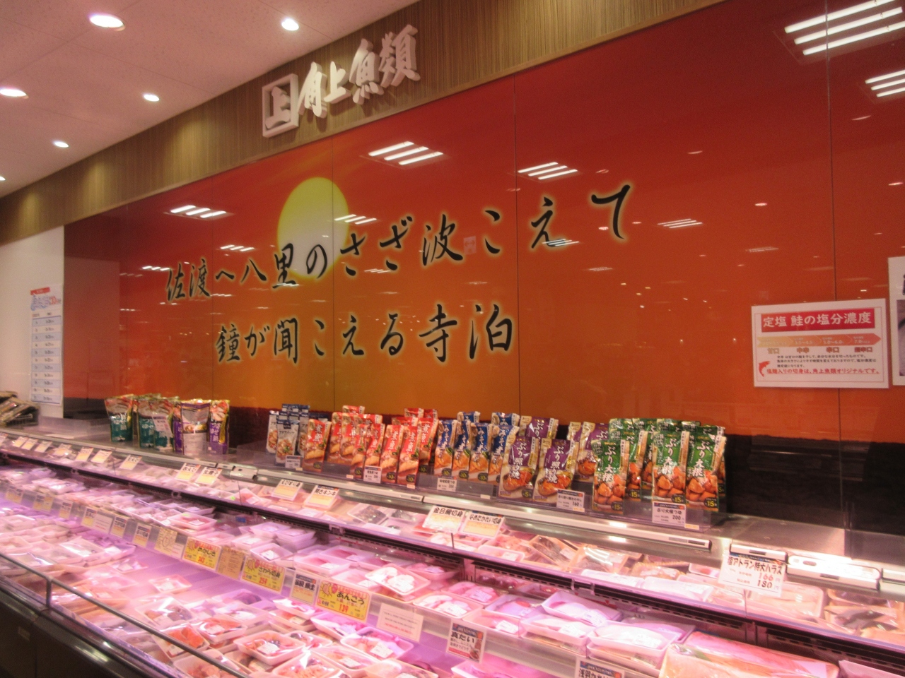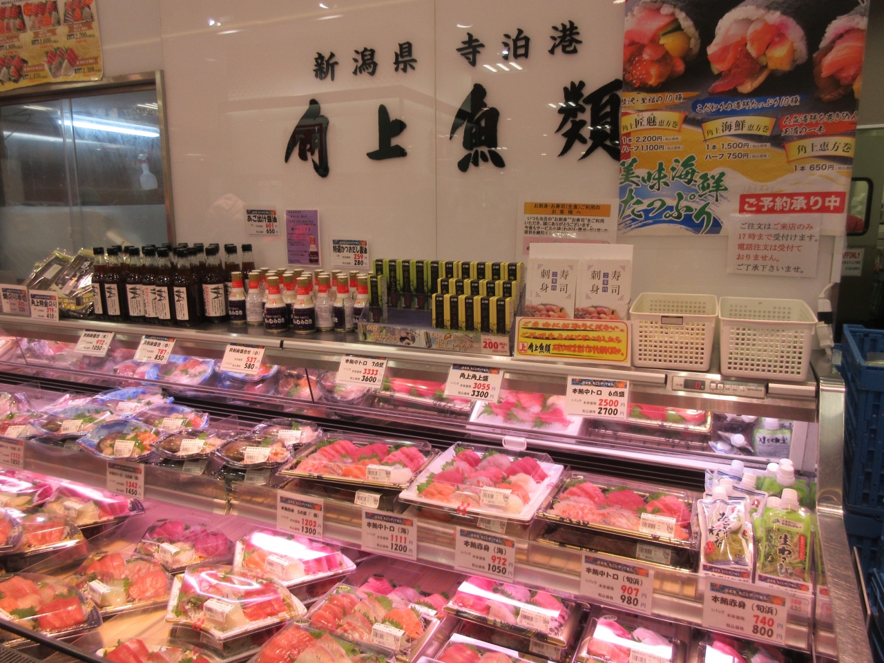 赤羽駅北口改札向かいのビーンズ赤羽にある富士ガーデン内にあります。スーパー富士ガーデンの奥に角上魚類の広いコーナーがあります。スタッフが数人働いている作業場前のケースに生きている貝やなまこ、1匹で売られている旬の魚がずらりと並んでいて、さばいてもらうことができます。注文した魚をさばいてもらうのを並んで待っている人たちがいました。魚をそのまま買う場合、値段シールを貼ってもらい受け取ります。きれいに盛り付けられた刺身の種類が多いのにも驚きました。切り身や冷凍エビなどの種類も多かったです。調理加工された商品もあり、訪れた平日午前混んでいました。刺身盛り合わせや寿司盛り合わせ各種を電話予約できます。新鮮な魚と活気を見て、旅先の鮮魚店に来た気分になりました。おすすめの鮮魚店です。