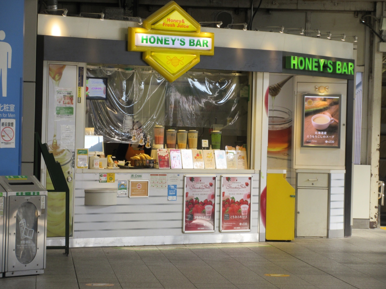 JR巣鴨駅改札内にある、はちみつと新鮮な果物や野菜を混ぜ合わせた飲み物を提供するジューススタンドです。メニューは温かいものと冷たいもの合わせて10種類ほどあり、季節柄、とちおとめを使用したスムージーも販売されていました。自販機のペットボトルもよく利用しますが、栄養面を考えるとここの飲み物をつい利用してしまいます。今回は、あまりに寒い日だったので、温かで濃厚なコーンスープをいただきました。心身ともに温まりとても美味しかったです。