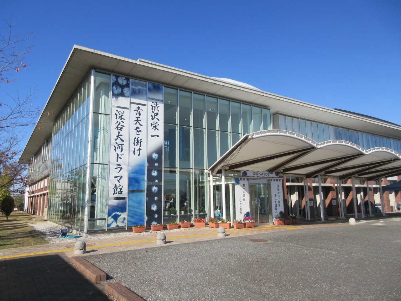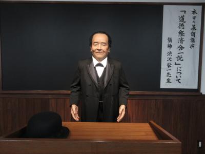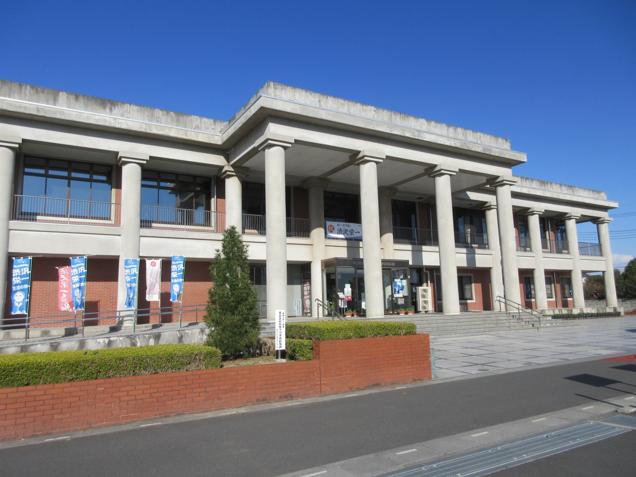 花園ICから北へ15kmほどの小学校の向かいにあります。八基公民館と記念館が一緒になっています。渋沢栄一の略歴や書簡などが展示されています。大河ドラマで取り上げられていた藍玉製造農家の番付表、尾高惇忠の書「神託」、諏訪神社で舞われた獅子舞の獅子頭、飛鳥山の邸宅敷地についての渋沢栄一の遺言書など、興味深い資料を見ることができます。公民館の体育館で深谷や渋沢栄一を紹介する映像を見ることができます。一番の特徴は70代のころの渋沢栄一のアンドロイドによる約8分間の講演「道徳経済合一説」を見聞きできることです。事前予約が必要です。予約したので参加しました。初めて間近で見るアンドロイドの精巧な表情に驚きました。眉毛がぴくっと上がったのにはびっくりしました。講演後写真撮影ができて記念になりました。清水川に面したテラスに大きな渋沢栄一像が建っています。