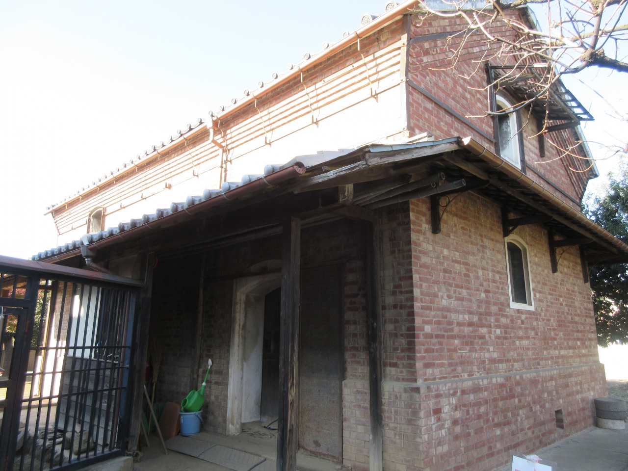 花園ICから15分ほどのところにある木造建築です。日本煉瓦製造会社の煉瓦製造施設建造と煉瓦製造技術を指導したナスチェンテス・チーゼ技師の住居兼工場建設事務所だった建物です。チーゼらが帰国した後は会社の事務所として使われてきました。国の重要文化財です。テラスが面している庭から見ると土台が煉瓦で作られているのがわかります。門柱は明るい色の大きな煉瓦で造られ、道路沿いの広い歩道にも煉瓦が敷かれています。日本の近代産業を指導した外国人たちの働きを思う建物です。ホフマン輪窯6号窯は残念ながら公開休止です。