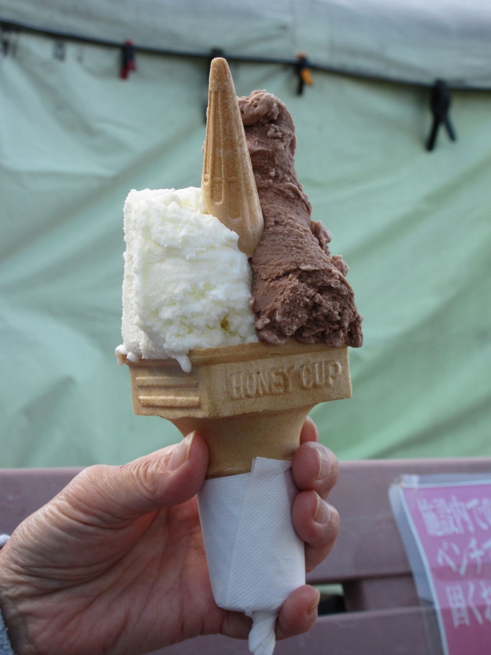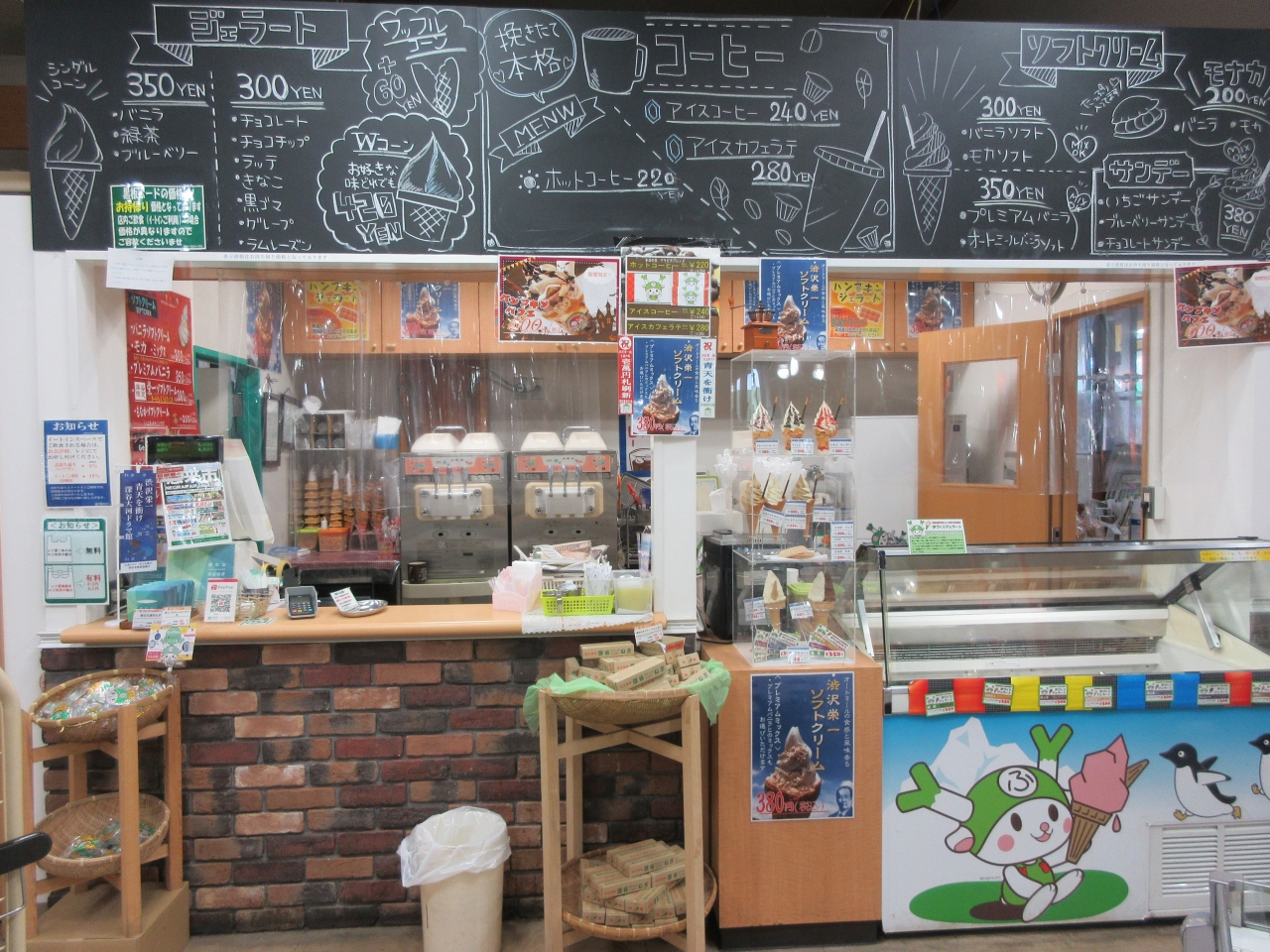 深谷市岡部の17号バイパス沿いの道の駅おかべ本館にあります。テイクアウトのジェラートです。訪れた時は7種類のジェラートとソフトクリームがありました。チョコレートとラッテをダブルコーンで注文しました。本館前のベンチで食べました。ミルキーのような甘さのラッテとあっさりしたチョコレートでした。シャリシャリした食感で、ジェラートの盛りがよかったです。ラッテの乳脂肪分が多いのが特徴です。IC入口へ向かう途中、乳牛舎がいくつかあり、どこの牛乳から作られたジェラートだろうかと思いました。