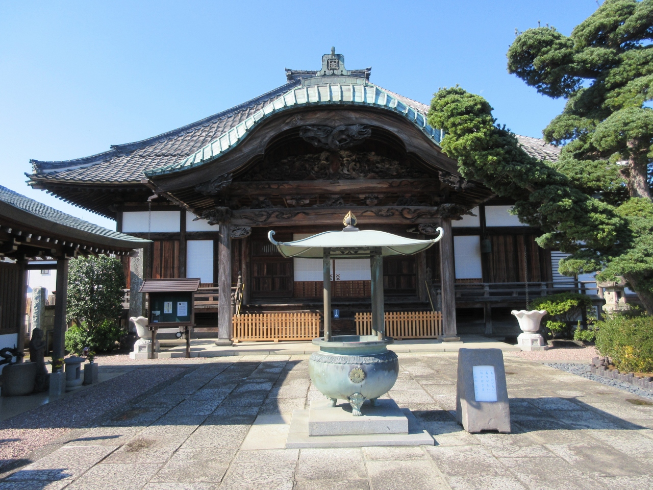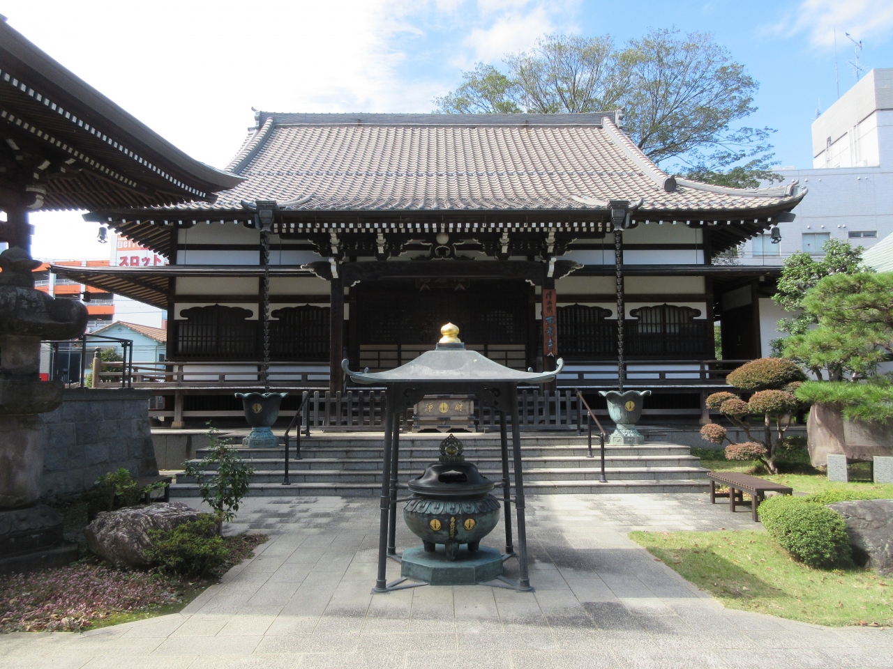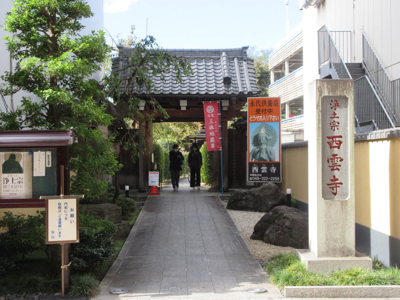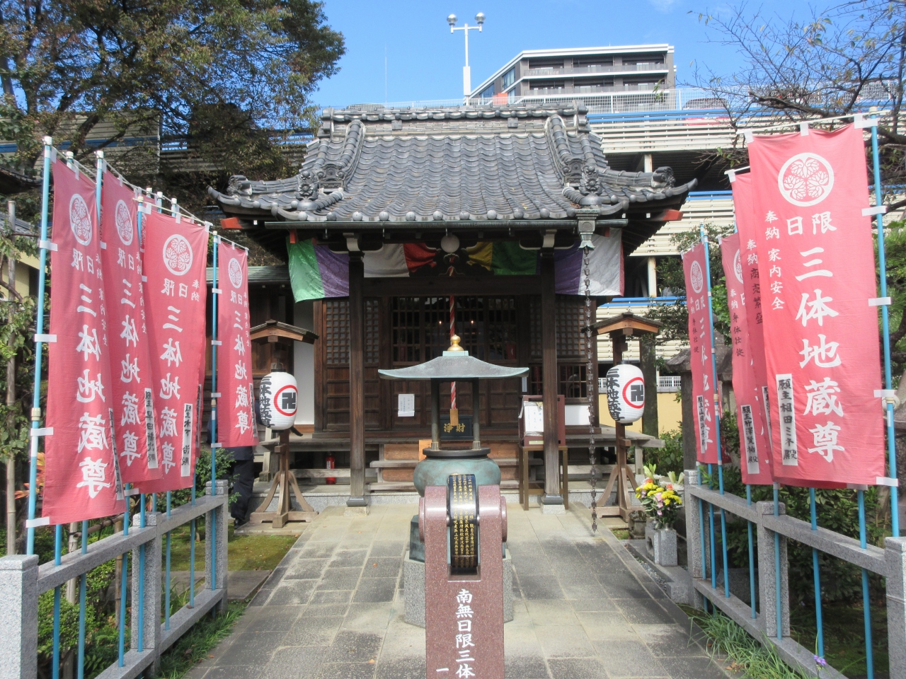 川越クレアモールの丸広百貨店の向かいに山門があります。17世紀に創建された浄土宗寺院です。クレアモールと山門の間に大きな石燈籠があります。木造山門を入ると、鐘楼があり木造瓦屋根の本堂があります。お参りする人がいました。本堂と寺務所の前に手入れされた庭があります。右奥に日限三体地蔵尊のお堂があります。見にくいですが、小さな地蔵が三体並んで祀られています。お堂の前に幟が奉納されていて篤く信仰されていることがわかります。人通りの多い川越クレアモールのにぎやかさと対照的に境内は静かでした。川越散策でクレアモールを歩く際に寄ってみてはいかがでしょうか。
