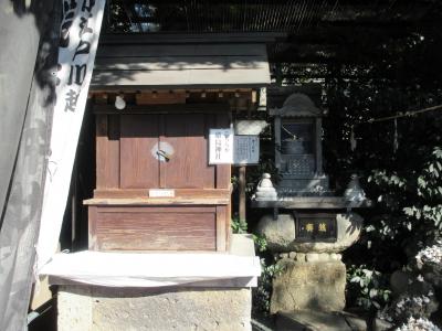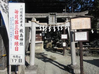 本川越駅から北へ進み、連雀町交差点を過ぎたところにある川越熊野神社境内に建っています。川越銭洗弁天の縁日は毎月第三日曜日に行われます。創建は不詳ですが、明治になり川越熊野神社に遷移されました。石鳥居の奥に小さな木造社殿があります。銭洗い用のひしゃくとざるが隣の池に置いてあり、参拝者が銭洗いをしていました。厳島神社の脇の石造祠に撫で蛇様が祀られているので、共にお詣りしてはいかがでしょうか。