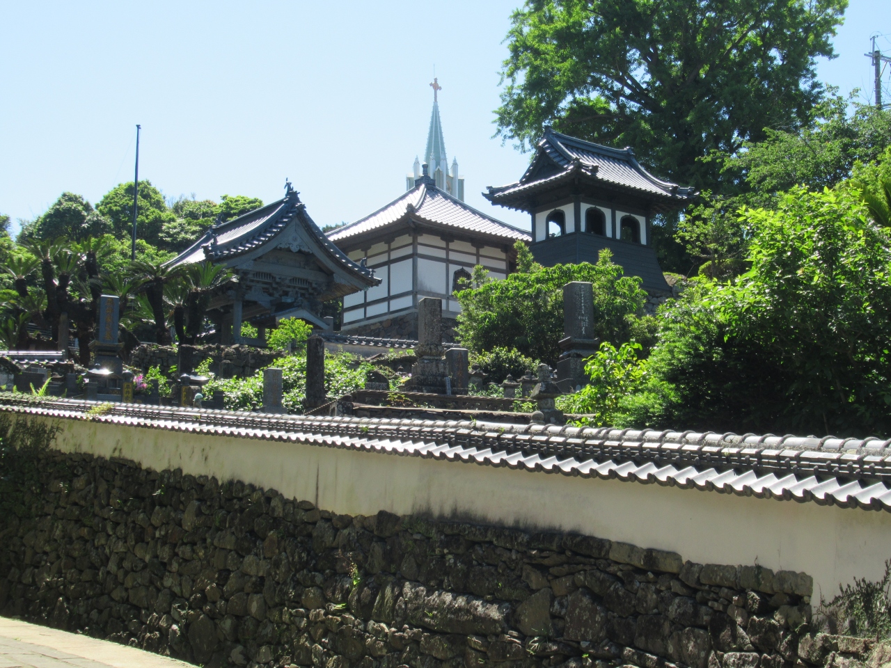 平戸のメインストリートからザビエル記念教会に向かう石畳の階段から見える、平戸を象徴する景観です。平戸のポスターやパンフレットに必ずと言っていいほど掲載されているエリアで、石畳から瓦屋根の寺と十字架がそびえるザビエル記念教会を眺めることができます。周辺はキリスト教が弾圧されていた中で、じっと耐え、信仰し続けてきた平戸の歴史を垣間見ることができるエリアです。