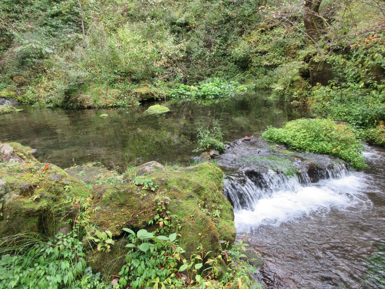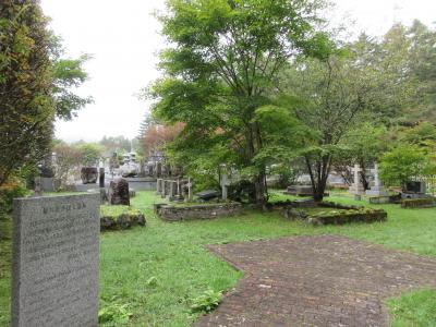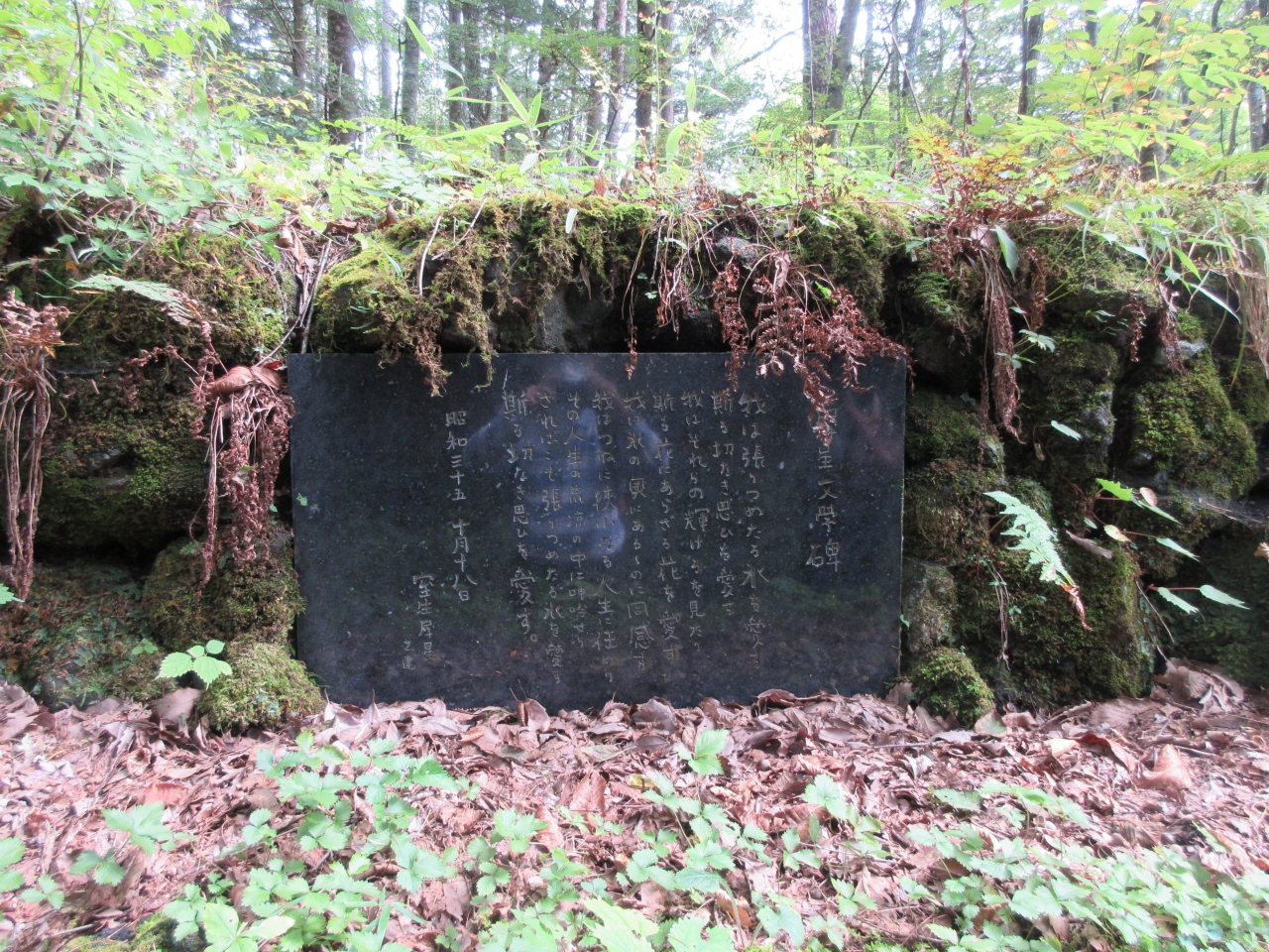 軽井沢開発の父と言われるカナダ生まれの宣教師・ショーによって軽井沢に最初に建てられた教会・ショー記念礼拝堂から7分ほど、矢ヶ崎川に架かる二手橋を左に曲がった川沿いに案内板があり、その先に小さな碑が土や草に隠れるようにして保存されています。犀星がかげろふ日記遺文で野間文芸賞を受賞した記念に、詩を選択、設計、出費して建てた碑です。碑のそばには碑を守るようにして、犀星が旧満州国旅行の際に購入した二体の石の俑人像も建っています。周辺には広い敷地を持つ別荘が点在していて、これぞ軽井沢という雰囲気が感じられます。