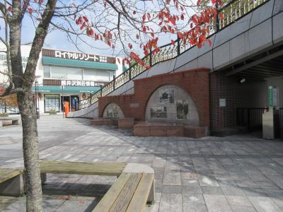 軽井沢駅1階北口を出たところに造られている広場です。桜が植えられ、歩道橋階段の下に造られたレンガの壁に、軽井沢会テニスコートや雲場池、ショー記念礼拝堂など軽井沢の観光地の写真が組み込まれています。観光施設ではなく、ベンチが置かれ喫煙場所といった雰囲気の広場です。