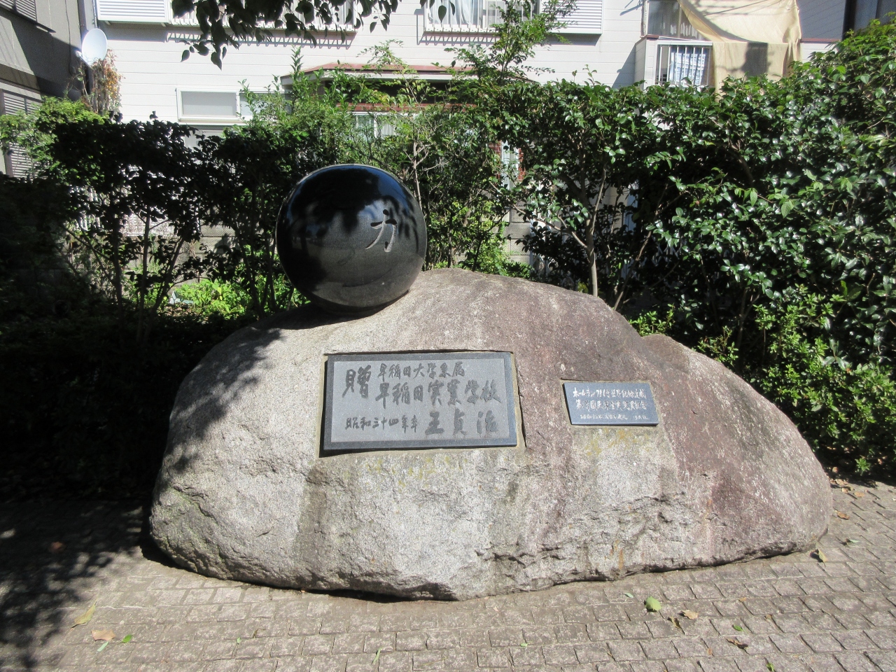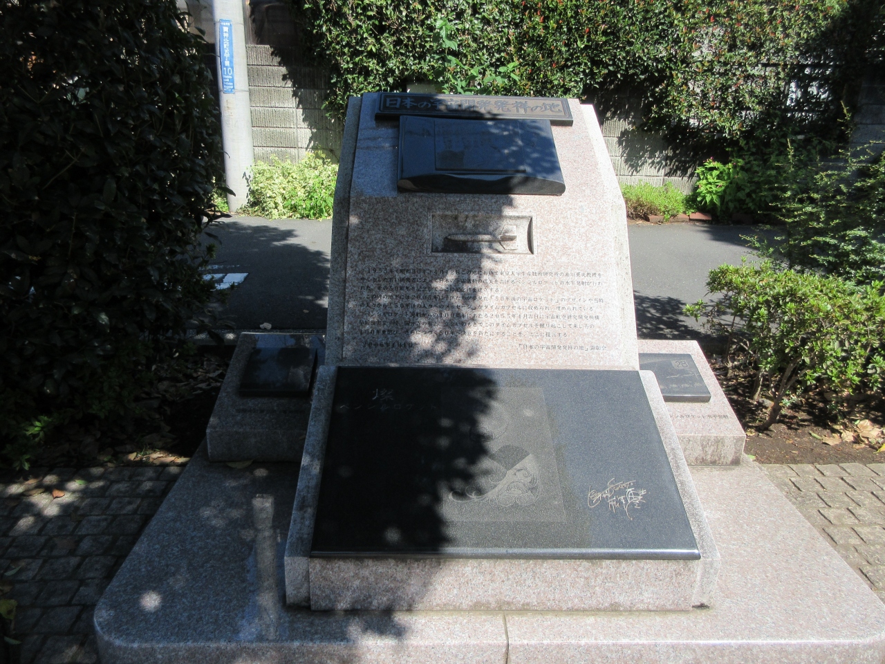 JR国分寺駅北口から450mほど、早稲田実業高校の正門手前に建つ二つの碑のうちの一つです。1955年に糸川英夫教授が中心になってペンシルロケットの水平発射が行われたことを記念して建てられた碑です。現在の早稲田実業高校のテニスコートあたりが最初のテスト実験の場所だったそうです。碑の下には2005年に夢見た、50年後の宇宙ロケットのデザインや50年後の人たちへのメッセージが入ったタイムカプセルが収められ、テスト実験から100年目の2055年に掘り起こされるそうです。34年後の掘り起こしが楽しみです。