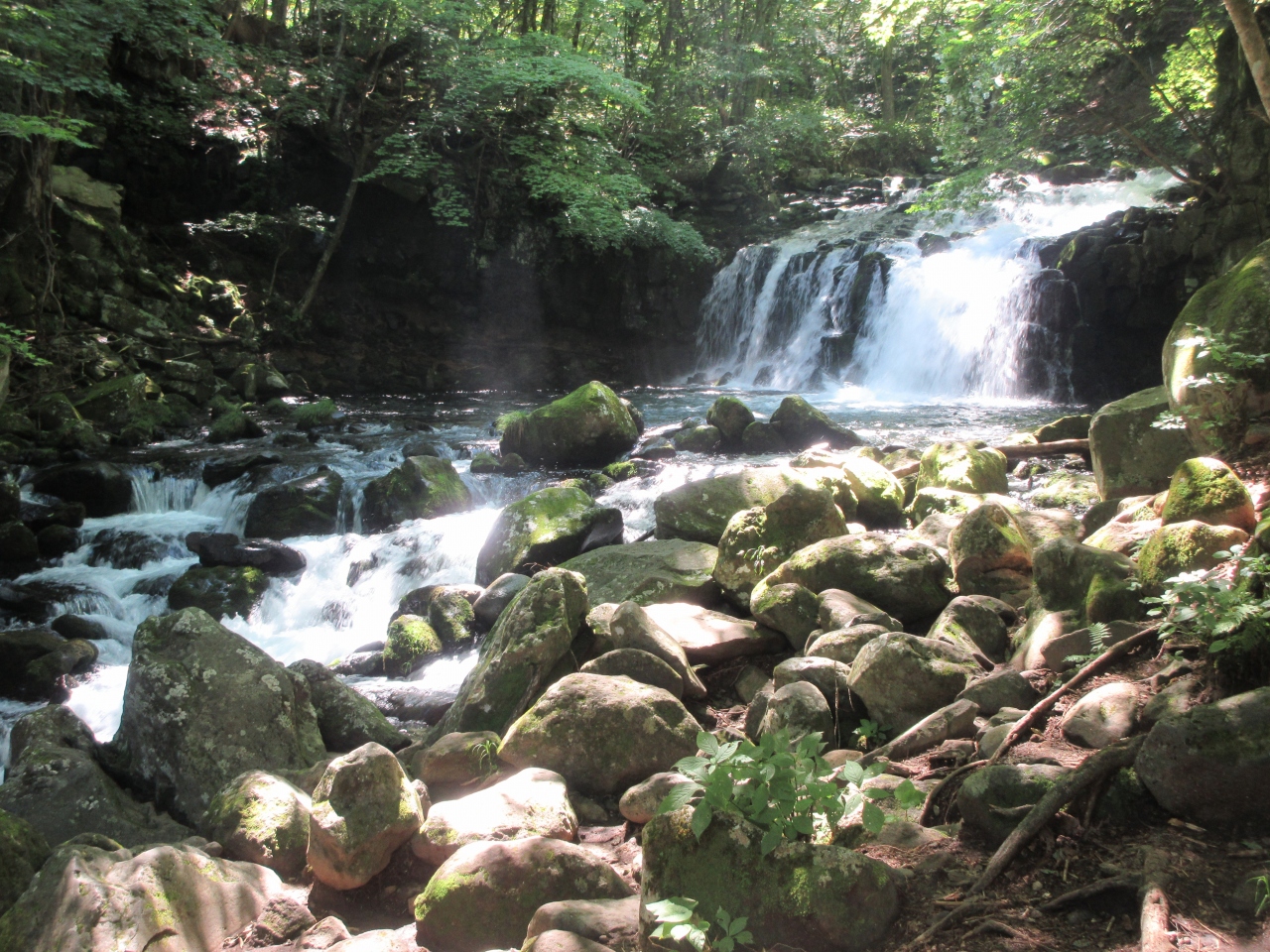 蓼科湖から車で1分ほどの滝の湯グランドホテル入口横の狭い山道を入り、600mほどのところに駐車場があります。駐車場からは歩いて10分ほどで滝が鑑賞できる四阿に到着します。昔は大滝と呼ばれていましたが、いつのころからか蓼科大滝と呼ばれるようになっていました。駐車場から滝までの山道には、コケが生えた大きな石や、幹や根か曲がりくねった原生林が形成されています。長い年月をかけて造られたことがわかる原生林です。かつては訪れる人も少なかった蓼科大滝ですが、最近は映画やドラマのロケが行われたり、小型の観光バスもやってきたりする観光スポットになっています。滝までの道は根や石がむき出しになっていて歩きにくく、雨が降った後はぬかるんでいるので避けた方がよいかもしれません。