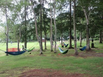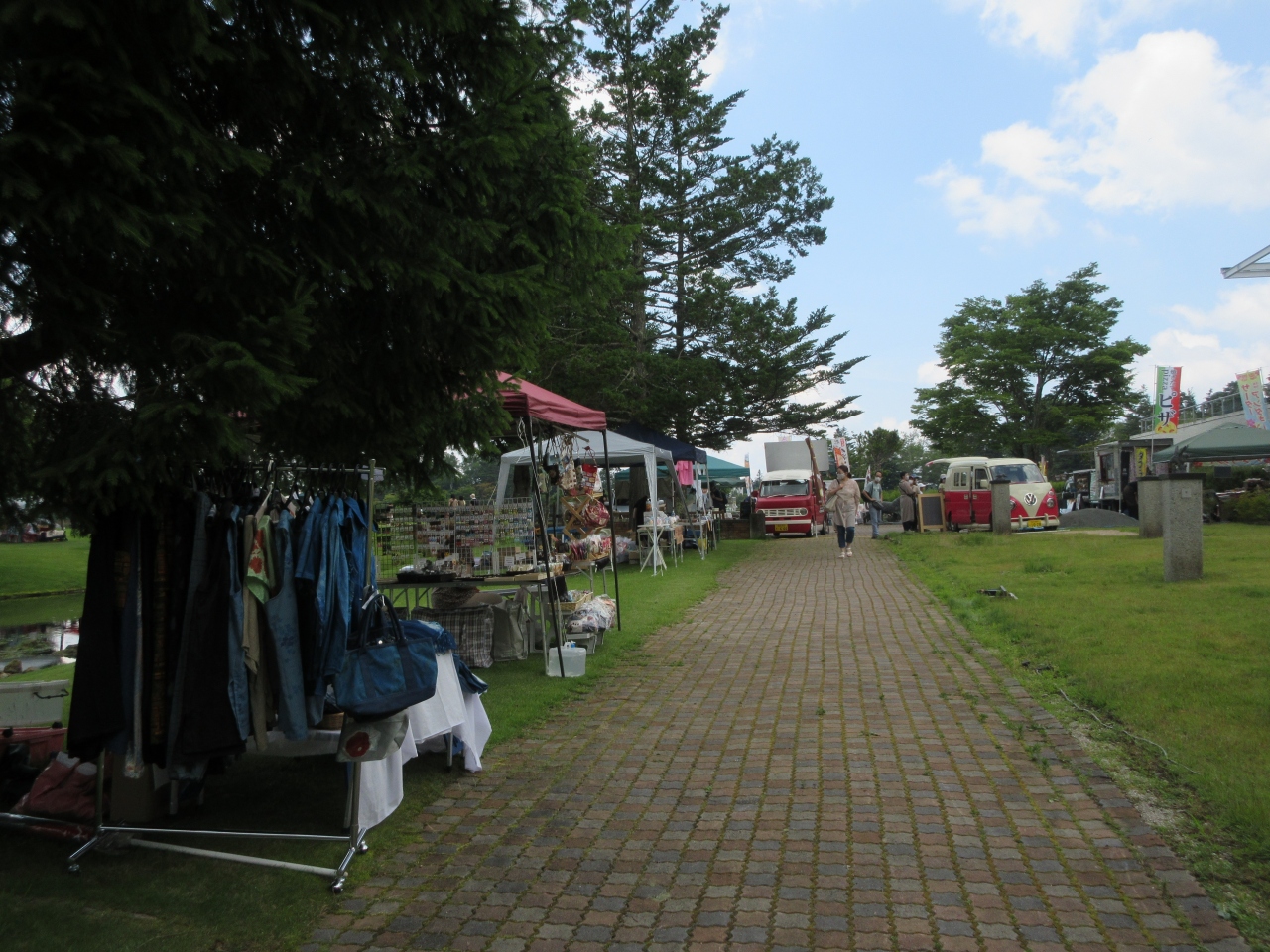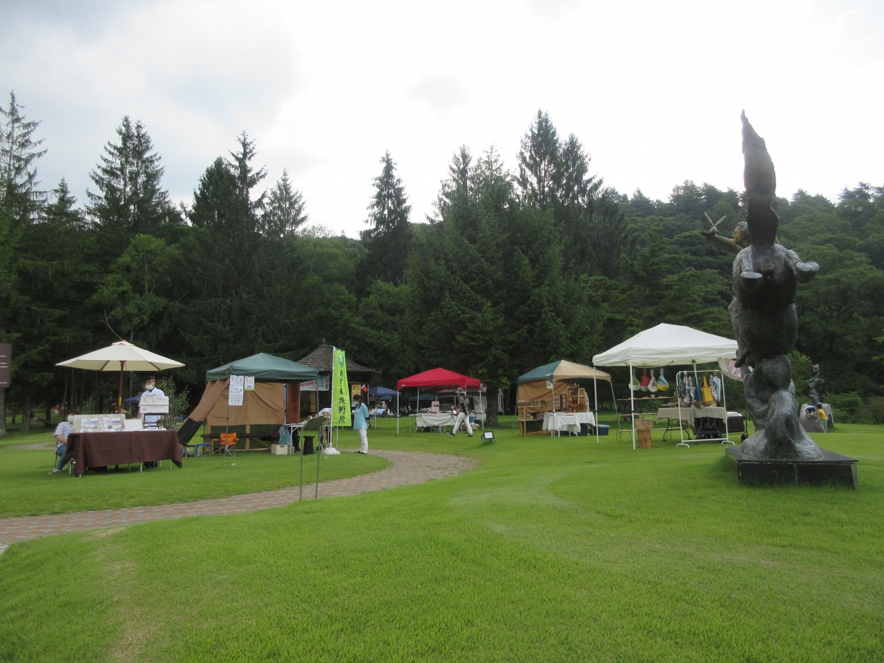蓼科湖散策で彫刻公園へ行くとイベントの幟が立っていました。7月の連休3日間に彫刻公園内に花束マルシェが開催していました。手作り雑貨や手作りアクセサリーや占いやマッサージなどが出店している花束ブース、東屋を中心としたライブ会場、キッチンカーなどが並んでいる飲食ブースがありました。雑貨やアクセサリーの出店が多かったです。懐かしい曲を歌っているライブ会場そばにハンモックが6つあり、寝ている人がいました。飲食ブースにカレー、蕎麦、ピザ、かき氷などの店がありました。周辺地域に進出したパルシステムのテントで説明を聞いて、今後の利用を検討しました。いつも静かな彫刻公園に今日は歌声が流れて、観光客がちらほら歩いていて久々に活気がありました。