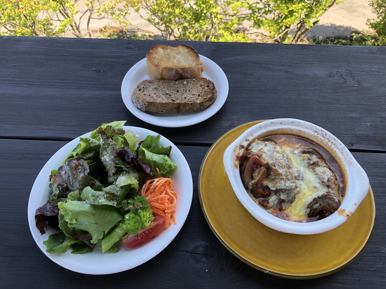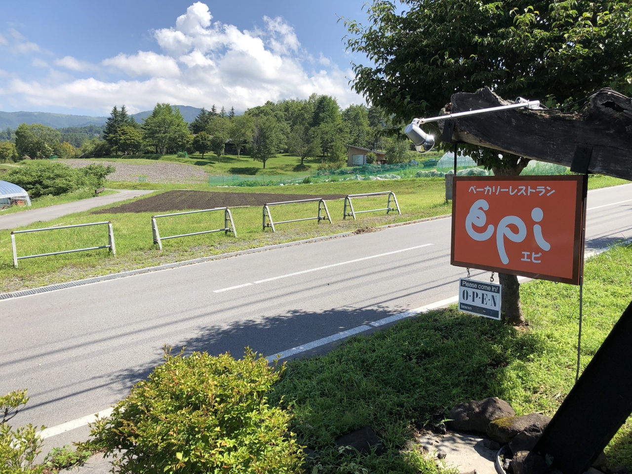 蓼科中央高原の299号線沿いにあるベーカリーエピでブランチをしました。9時開店直後に着いたら行列ができていました。デニッシュやパン1斤を買う人とテラス席で食べる人で混んでいました。オニオングラタンスープとデニッシュ、ロールキャベツセットを注文しました。昼食を兼ねてロールキャベツを食べました。スプーンで切れるくらい煮込んだロールキャベツは溶けたチーズがのっていて美味しかったです。量の多いサラダと2種類のパン2切れで満足しました。自分たちが食べ終えた10時にはテーブル席は空いて、売店に客はいませんでした。周辺の別荘に滞在している常連客が開店を待って利用していることがわかりました。