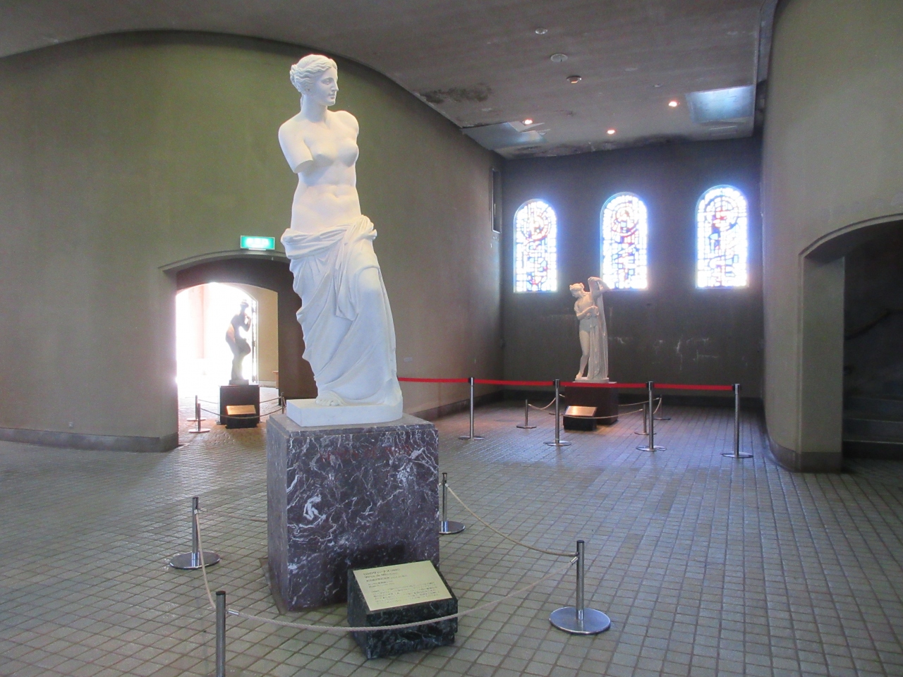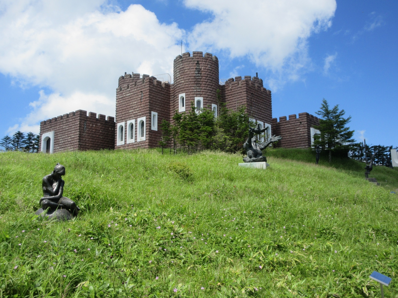 美ヶ原高原美術館の本館屋外展示場内の高台に建つレンガの外壁の城です。1階にミロのヴィーナスなど、模刻のビーナス大理石像が展示されています。ステンドグラスの窓を背にしたビーナス像は美しかったです。階段を上がって屋上に出て、2つの塔にさらに上がると屋外展示場や晴れたら周囲の山々を見ることができます。あいにく訪れた日は雲でかすんでいて遠くの山を見ることはできませんでした。城の外観は物語に出てきそうな中世ヨーロッパの城のようでわくわくしました。