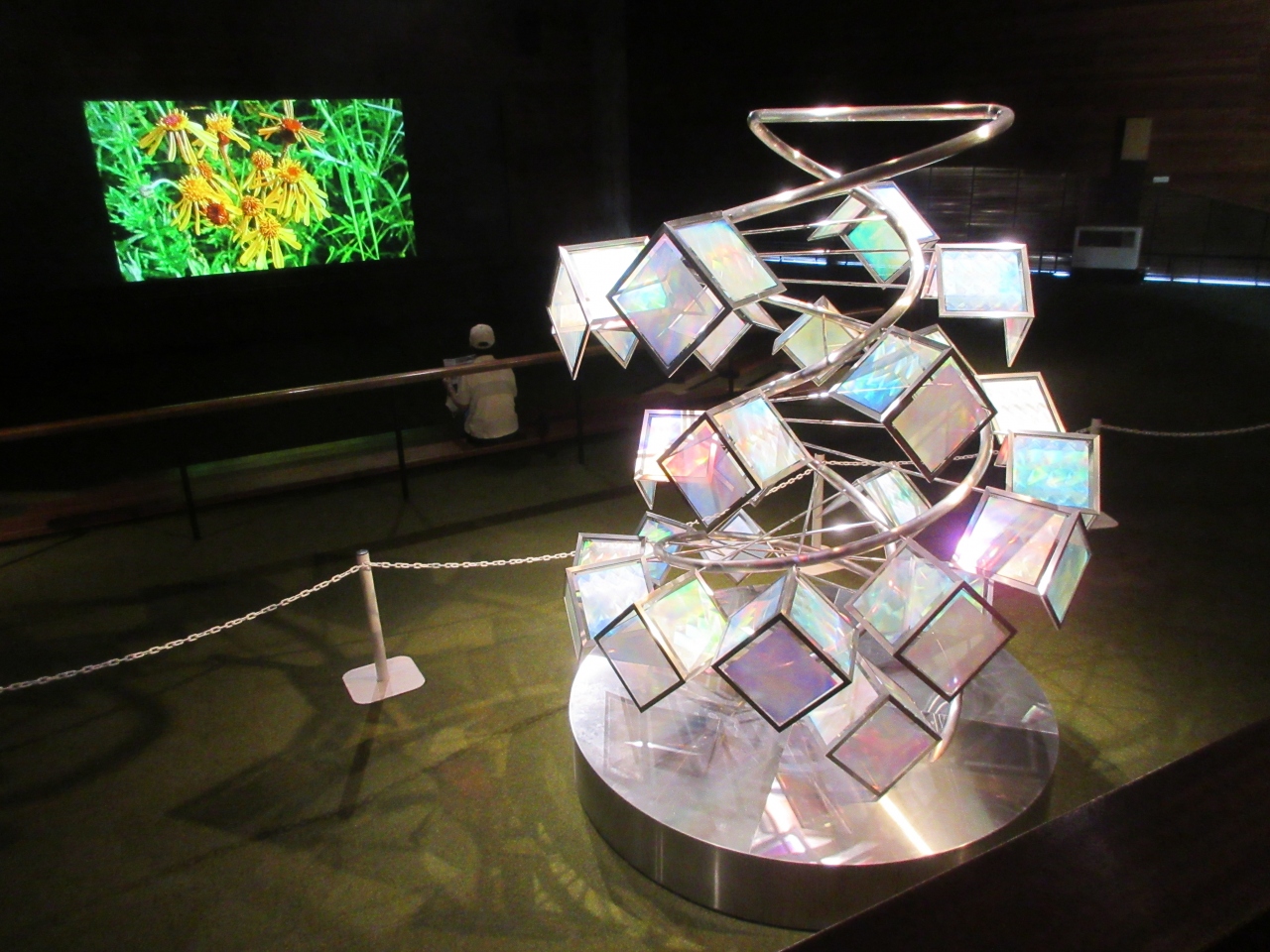 美ヶ原高原美術館にあります。現在はギャラリーⅡの名称になっています。美術館入口から屋外展示場へ出たところにある黒い石の外壁の建物です。スクリーンを囲み長い木製ベンチが4列あります。屋外展示場の作品や美ヶ原高原の高山植物などをスライド上映しています。作品の背景に夕暮れや雲海などが写っているものや、星空の下にある作品など興味深いものが流れていました。高山植物の名前と花の時期が一緒に映し出されていて今見られる花を知ることができました。訪れた日は暑く広い屋外展示場を歩き疲れたので、涼しい館内で静かな音楽を聴きスライドを見ながら休憩できてよかったです。