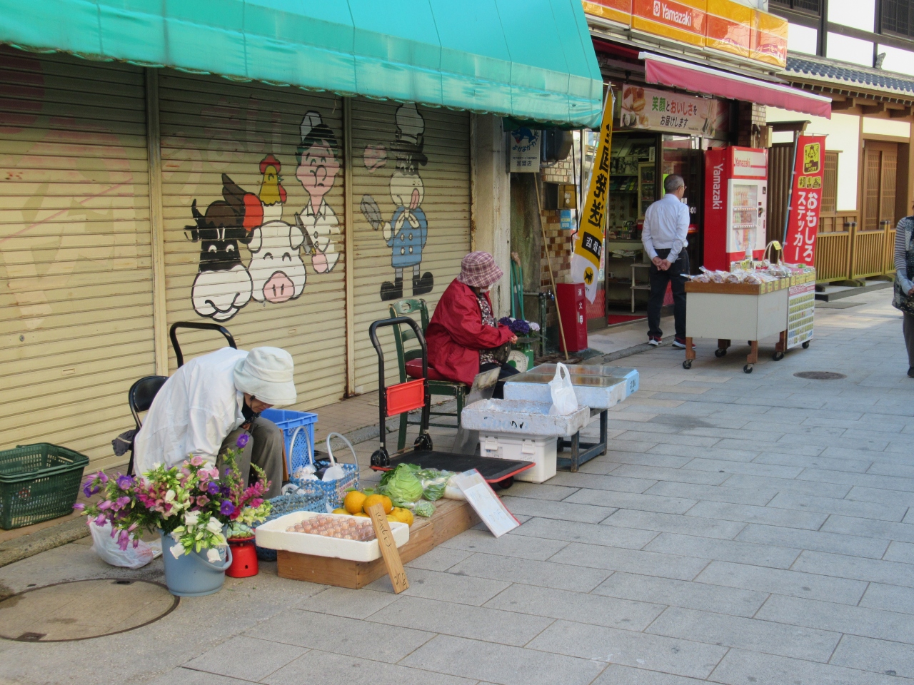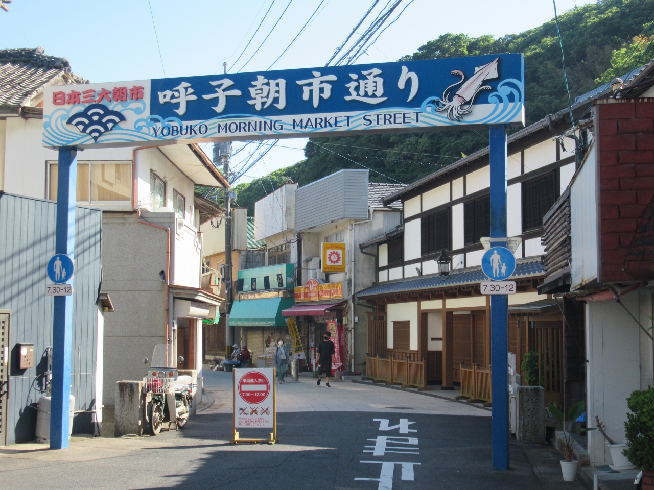 呼子港近くの松浦町商店街で、毎日7時半ごろから11時頃まで開かれている朝市です。日本三大朝市の一つで、200mほどの通りに商店の人が店の前に商品を出したり、シニアの女性が自転車で運んできた鮮魚や干物、加工品、野菜、果物、花、漬物などを路上に並べたりします。朝8時半ごろに立ち寄りましたが、路上に店を出しているのは15店ほどで、売られている商品も少なく、日本三大朝市というには活気が感じられませんでした。朝市に向かう途中で出会った地元の方の、路上に商品を並べ売っている人は少なくなっていますよという言葉が印象的でした。