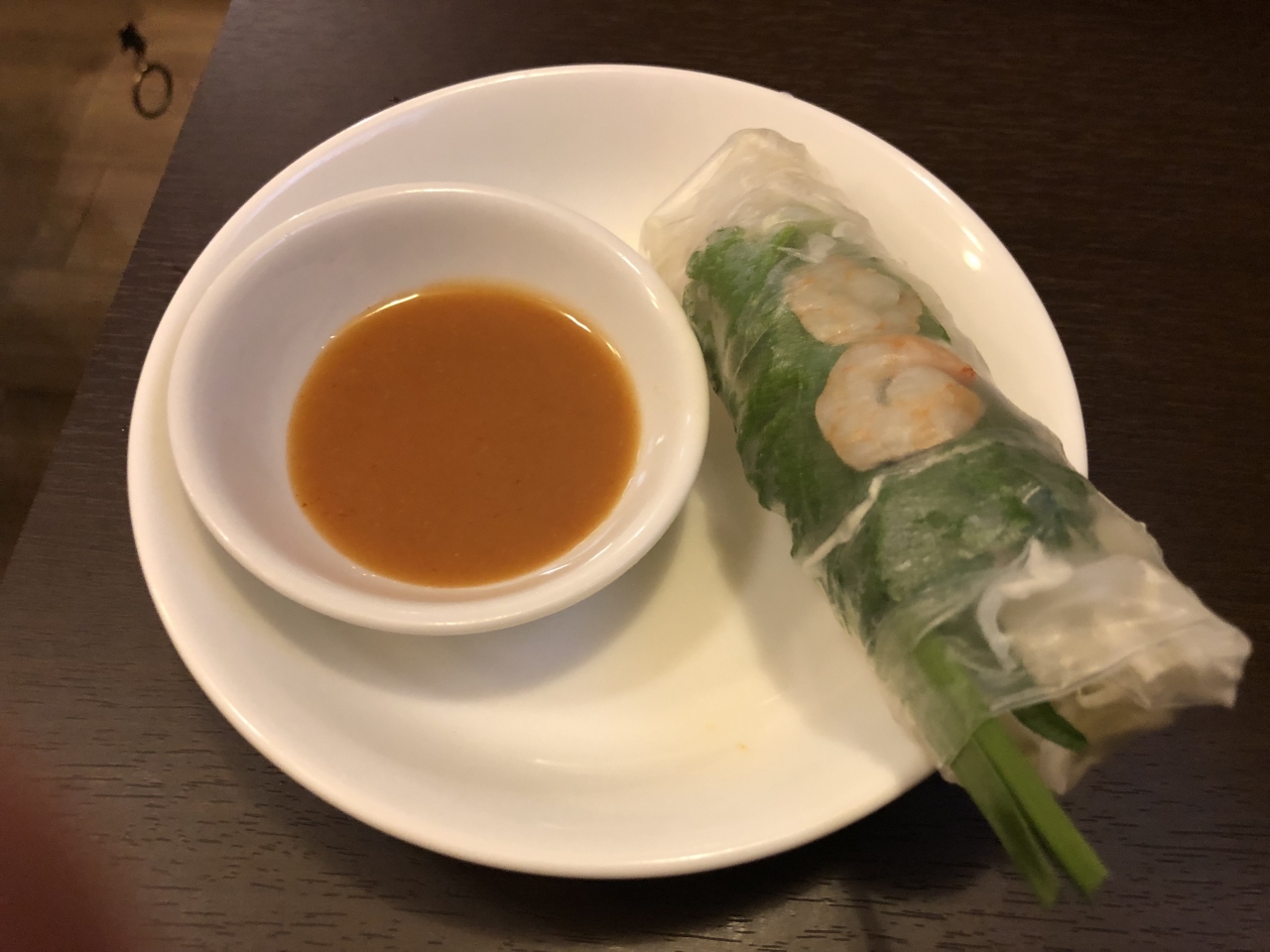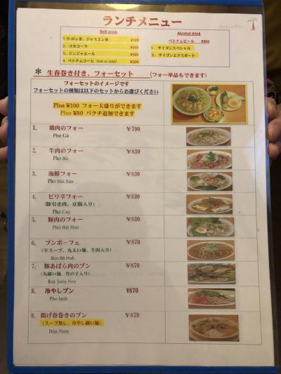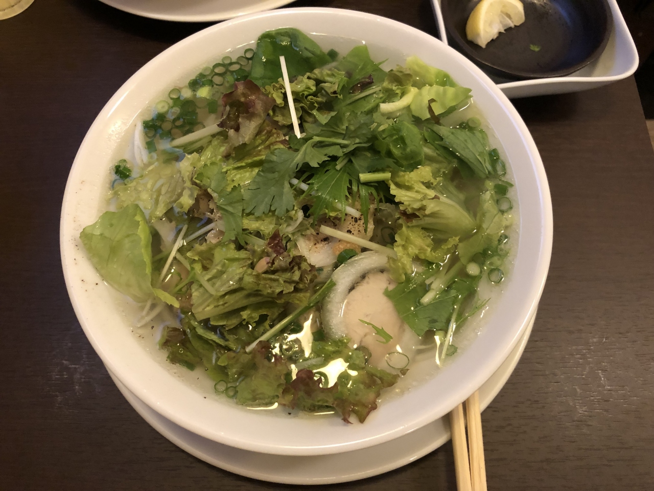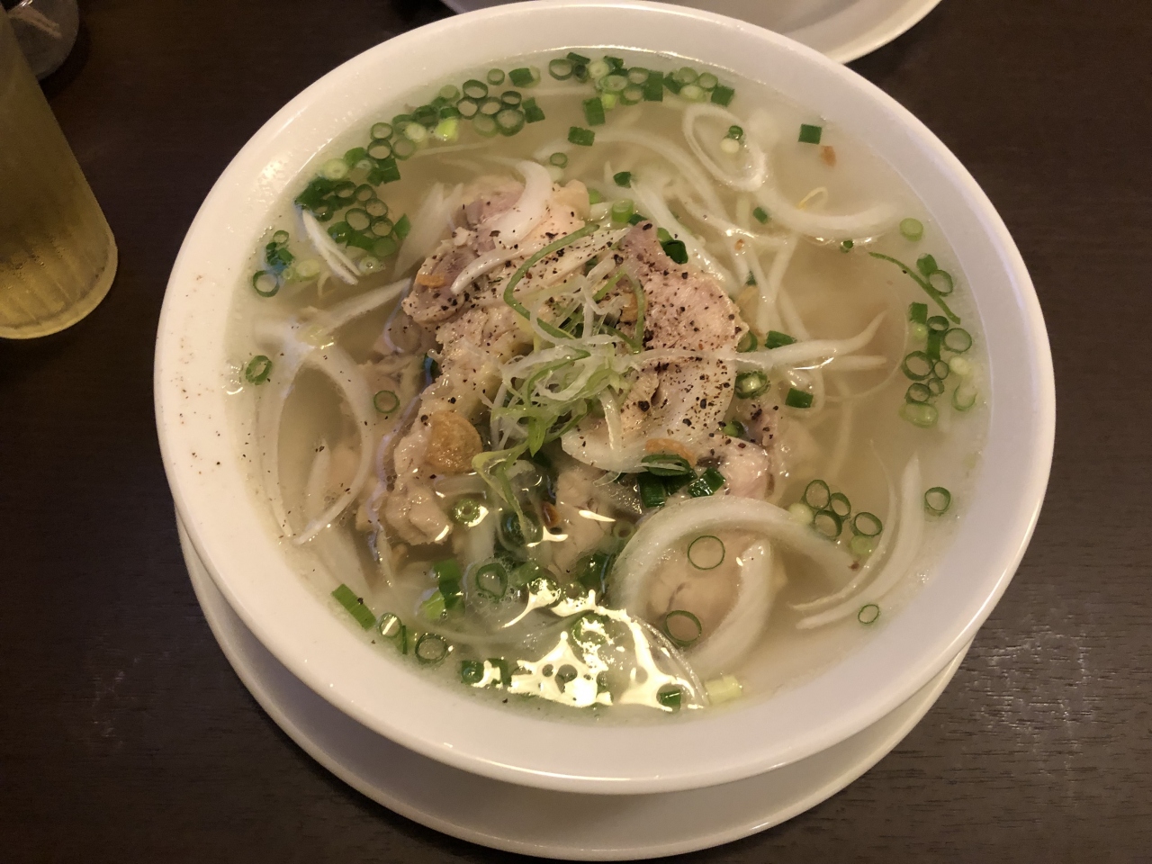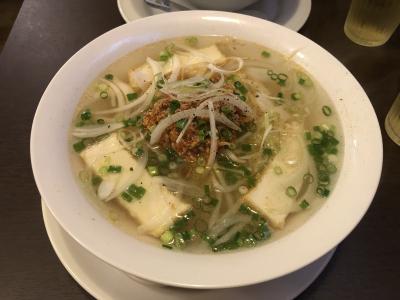 新大塚駅そばの大塚5丁目交差点近くの雑居ビル地下にあるフォー専門店で昼食をとりました。テーブルが3つ、カウンターに2席の狭い店内です。平日昼時だったので、テーブル席を片付けるまで外で待ちました。生春巻き付きフォーセットのランチメニューから、フォーを大盛にしたピリ辛フォーと鶏肉のフォーを注文しました。水菜やサニーレタスの生野菜がフォーと別に出て、食べる前にフォーに入れて、レモンと少量のパクチーを加えて食べました。豚挽き肉と厚揚げがのっていたピリ辛フォーは辛いのが好きな自分好みで、レモンと一緒に添えられていた唐辛子を連れの分も入れて辛くしました。鶏肉のフォーはやや甘口のあっさりしたスープに鶏肉の切り身がのっていました。生春巻きはキャベツの千切りがメインでエビなどが入っていました。ほんのりピリ辛の味噌風味のたれで食べました。他のフォーやブンのメニューがあったので次回は違うものを食べたいです。