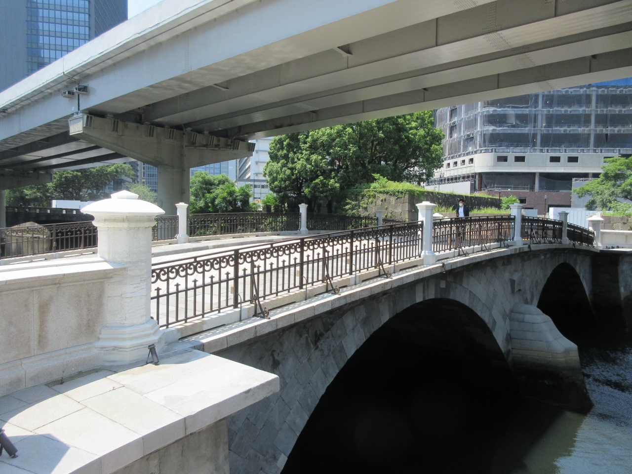 日本銀行に向かいに関東大震災後に造られた道路橋と、道路橋から70mほど離れたところに架かる歩行者専用の石橋が日本橋川に架かっています。道路橋は道幅も広く、色あせた姿は趣が感じられ、橋のたもとには近代日本の経済の基礎を築いた渋沢栄一の立像が建っています。歩行者専用の橋は、東日本大震災で一部が被災し、今年5月に復元されました。復元された橋の親柱は白い大理石で造られていて、欄干には植物の模様が施され、眩いばかりに輝いていました。40mほどの短い橋ですが、橋のたもとには石垣も残っていて、道路橋とは全く異なった姿をしていますが、道路橋同様趣が感じられました。江戸城外外郭の正門として重要な役割を果たしていた姿がよみがえる橋だと思います。